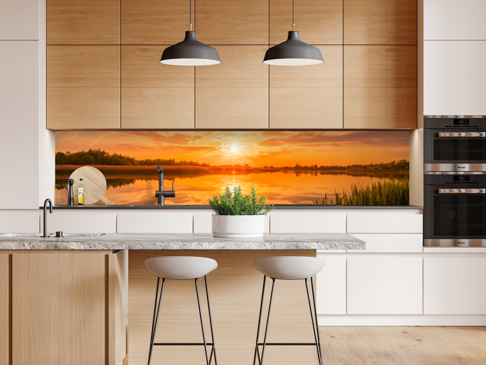 Naklejka repozycjonowalna Złoty zachód słońca nad spokojnym jeziorem