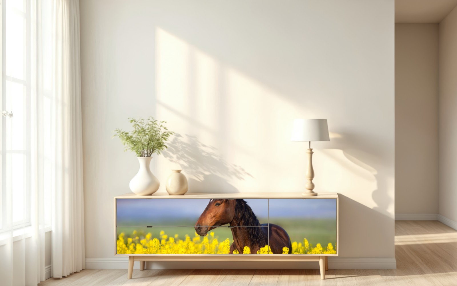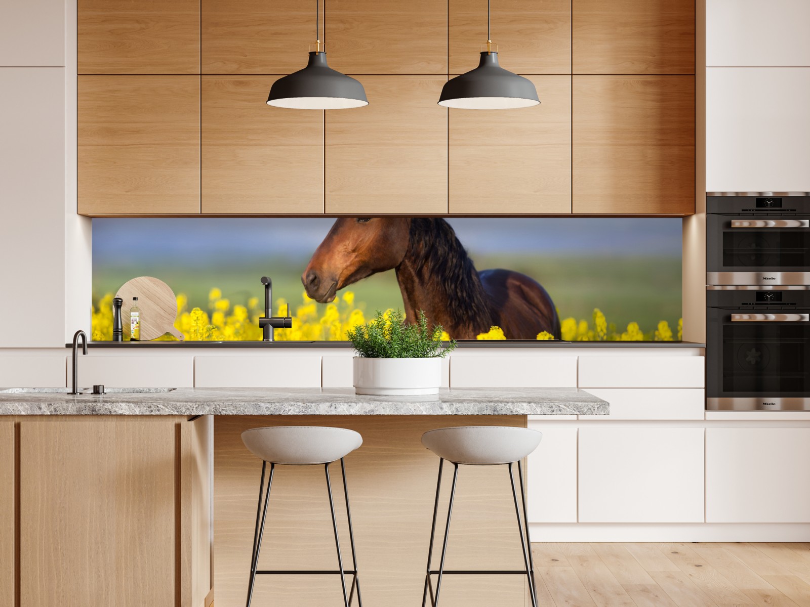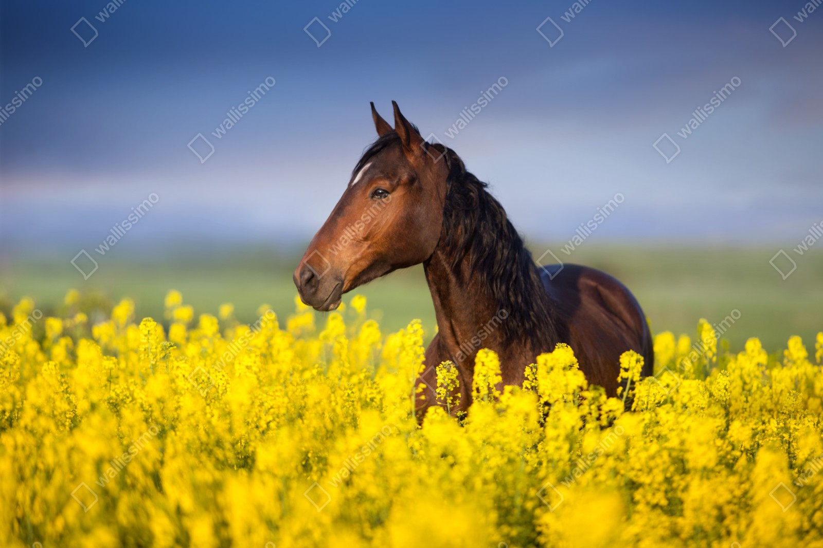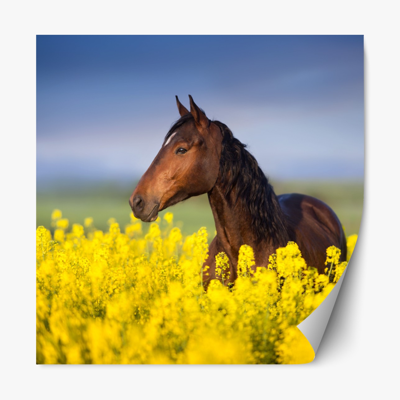 Naklejka repozycjonowalna Gniady koń na polu rzepaku