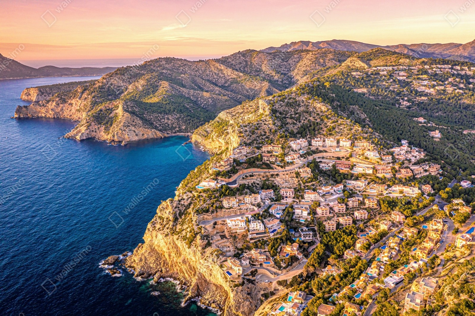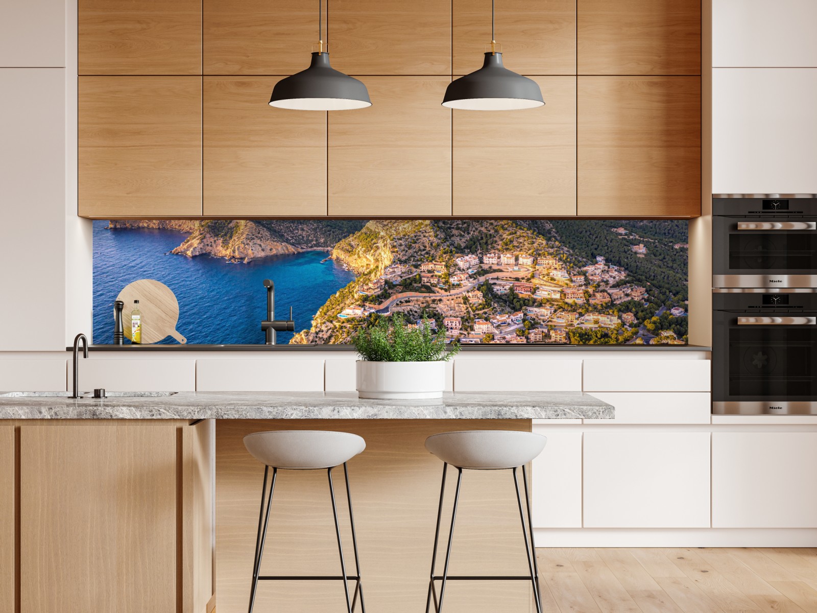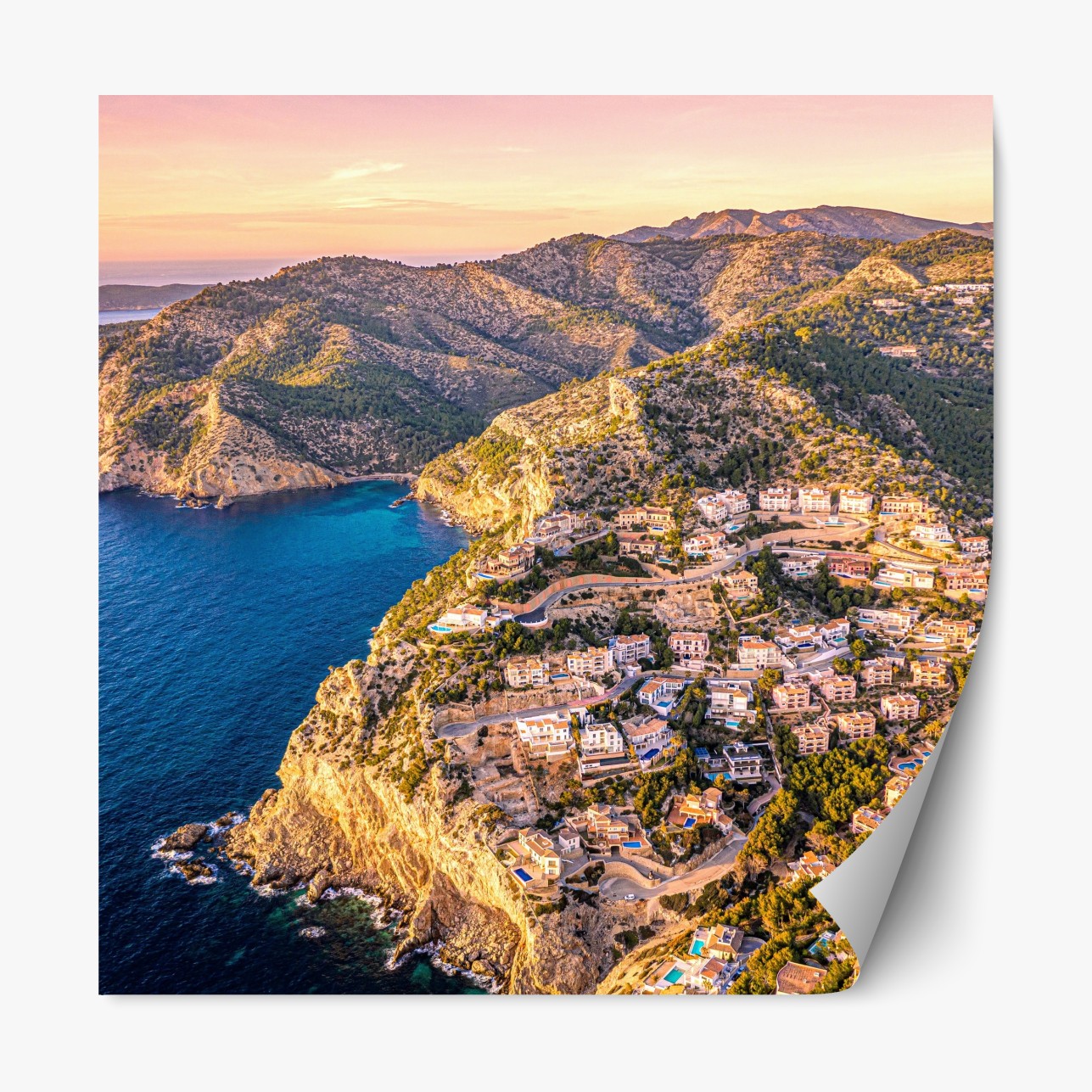 Naklejka repozycjonowalna Zachód słońca nad klifem i nadmorską wioską