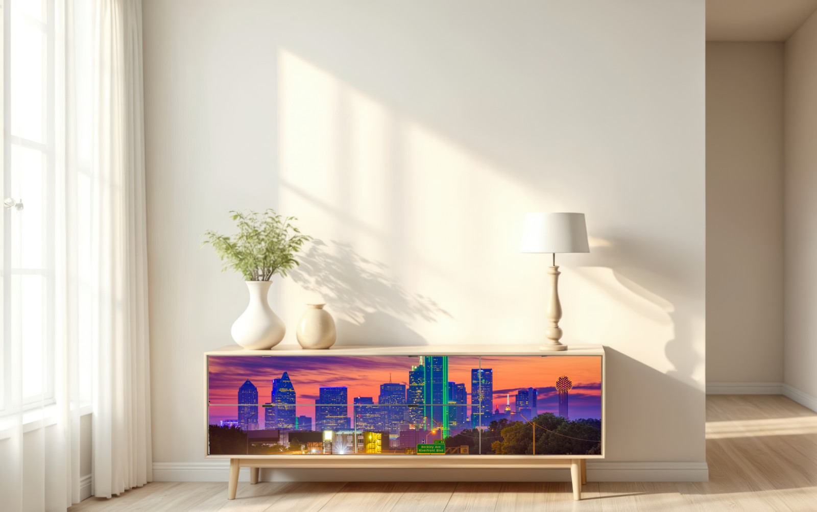 Naklejka repozycjonowalna Panorama Dallas o zachodzie słońca z świetlnymi smugami autostrady