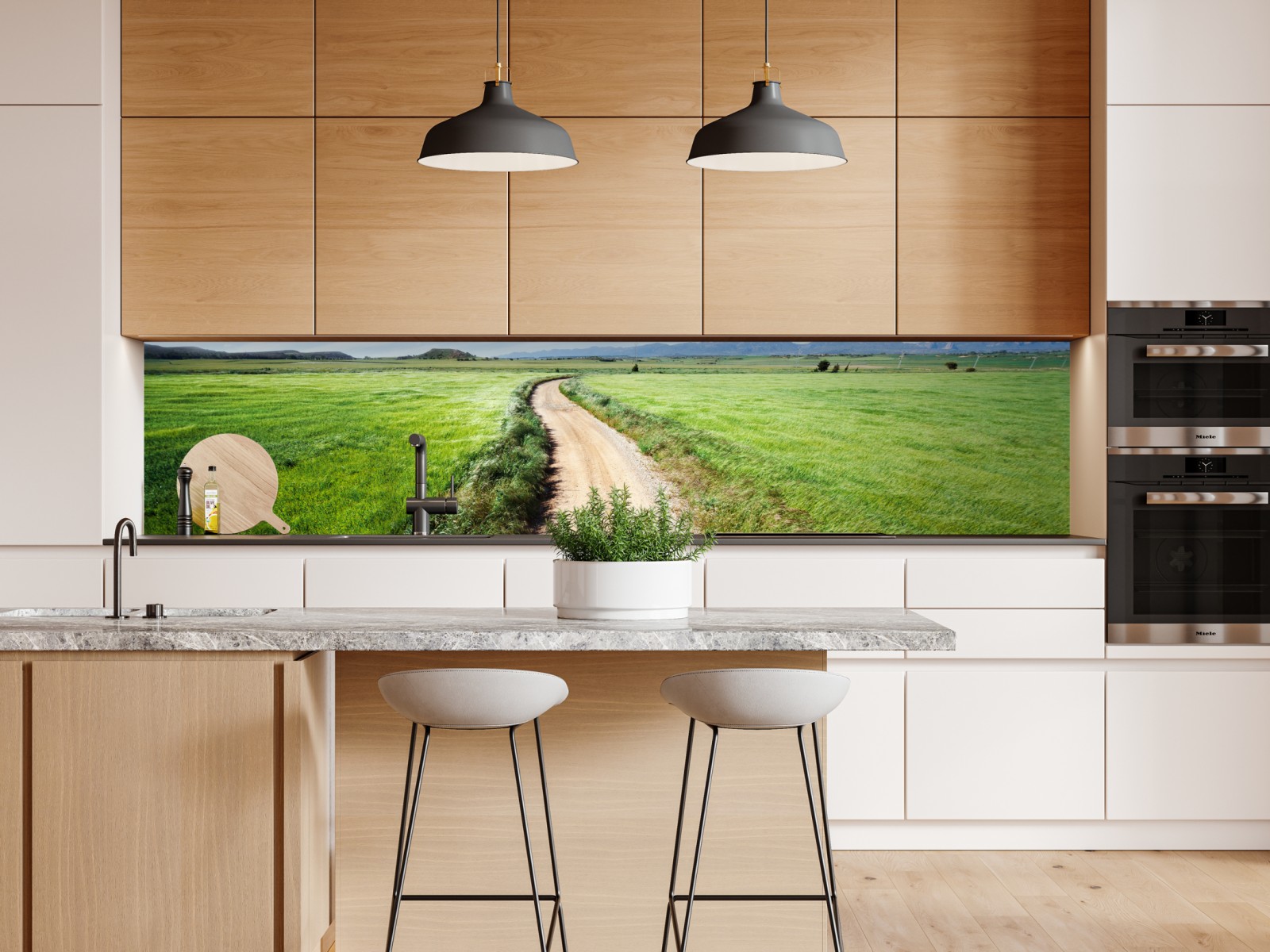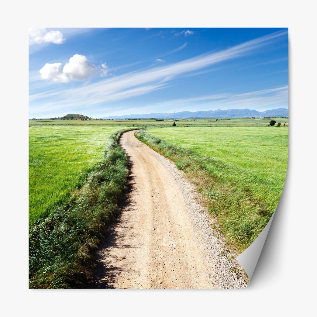 Naklejka repozycjonowalna Wijąca się wiejska droga przez zielone łąki