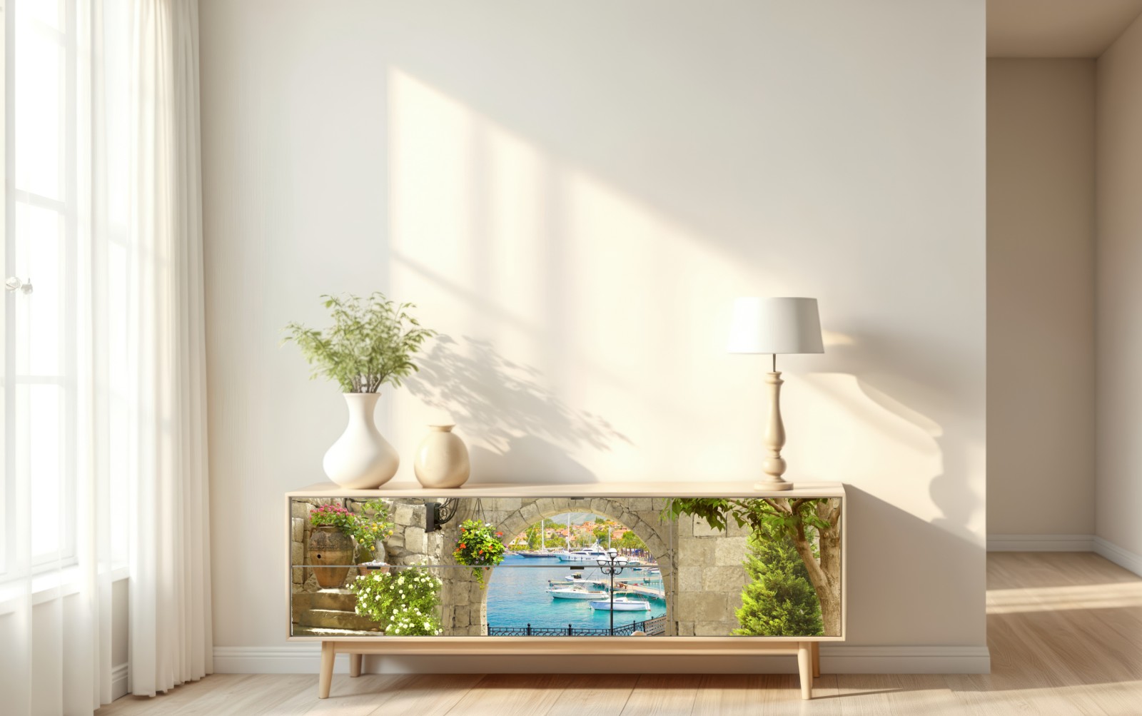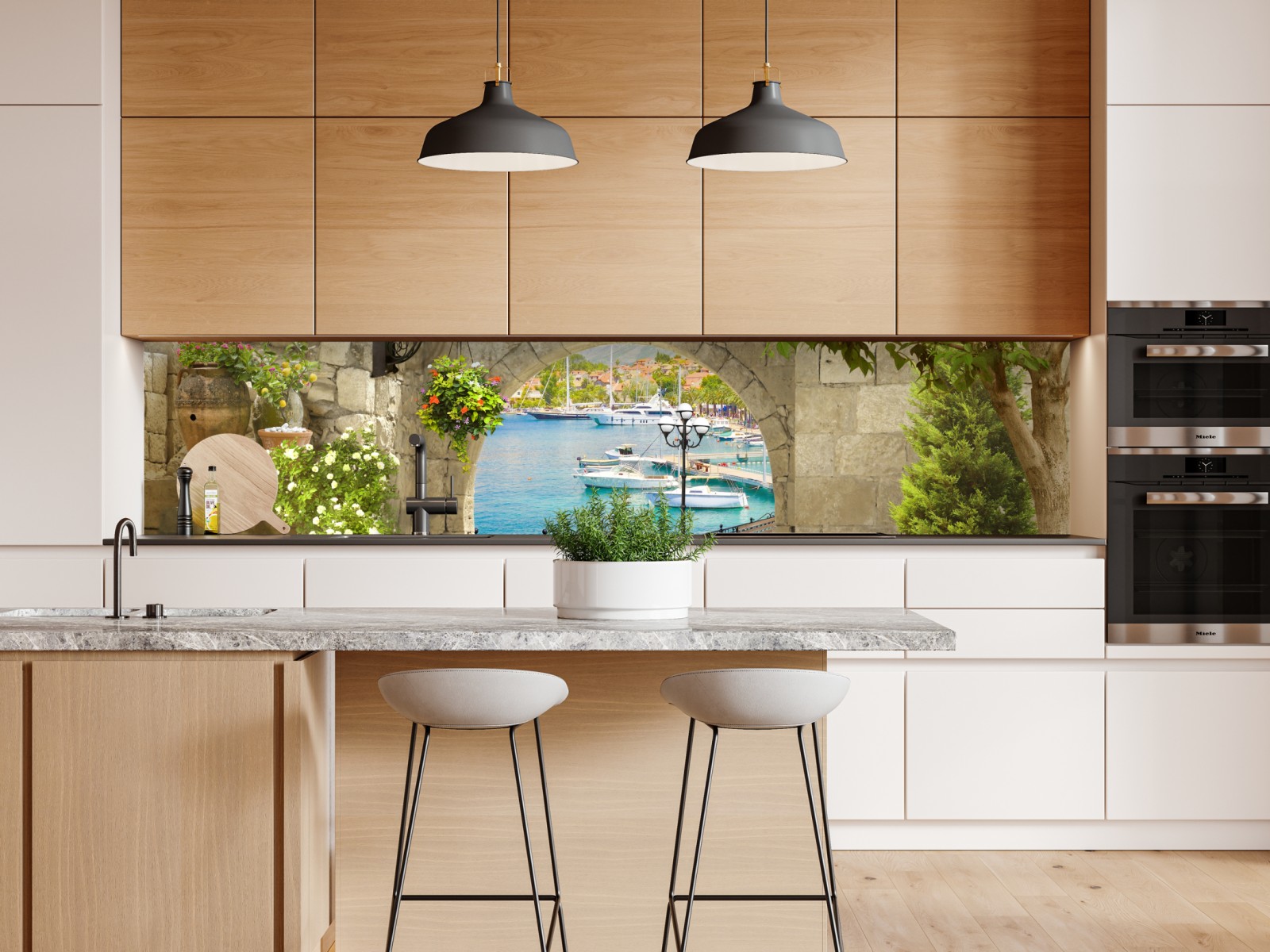 Naklejka repozycjonowalna Śródziemnomorski widok przez arkadę