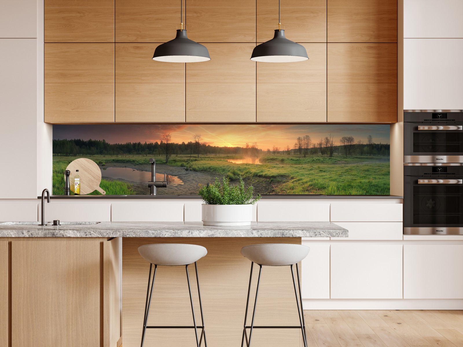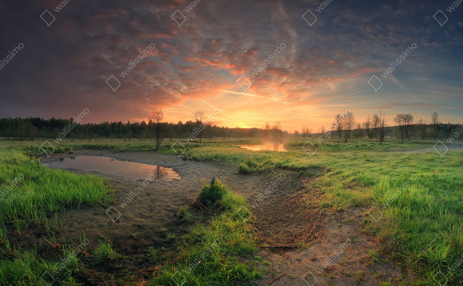 Naklejka repozycjonowalna Zachód słońca nad spokojną łąką