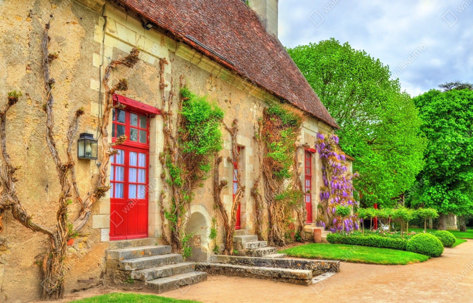 Naklejka repozycjonowalna Uroczy domek z kwitnącą glicynią