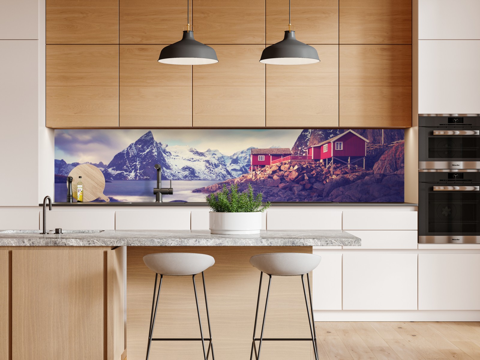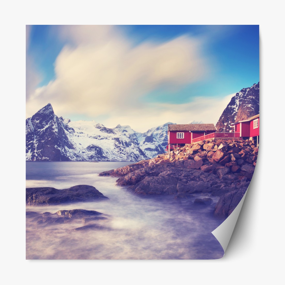Naklejka repozycjonowalna Górski nadmorski krajobraz z czerwonymi domkami