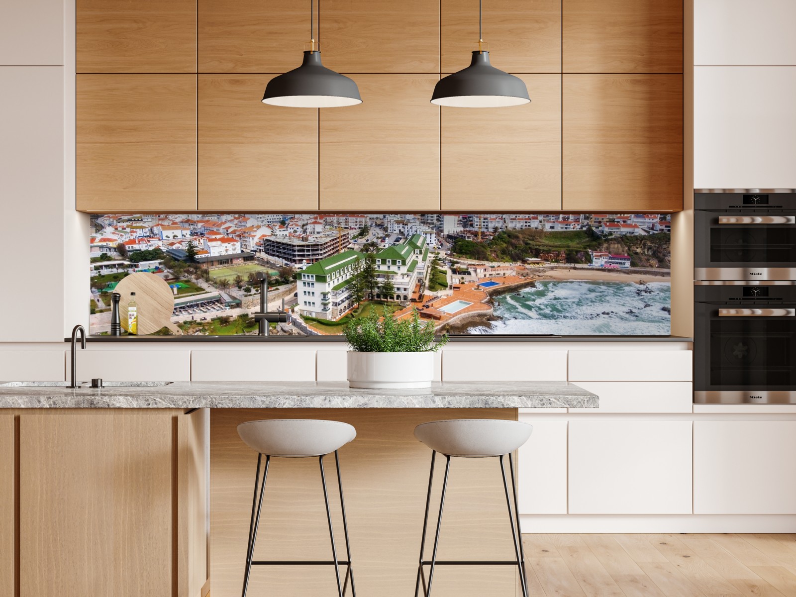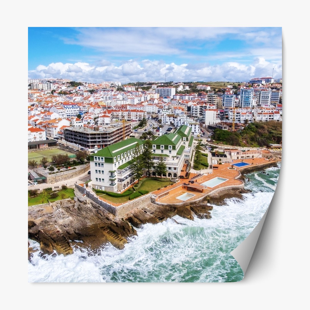 Naklejka repozycjonowalna Widok z lotu ptaka na nadmorskie miasteczko z falami