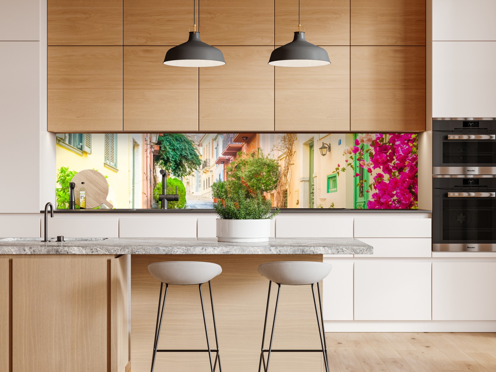 Naklejka repozycjonowalna Słoneczna grecka uliczka z bougainvilleą
