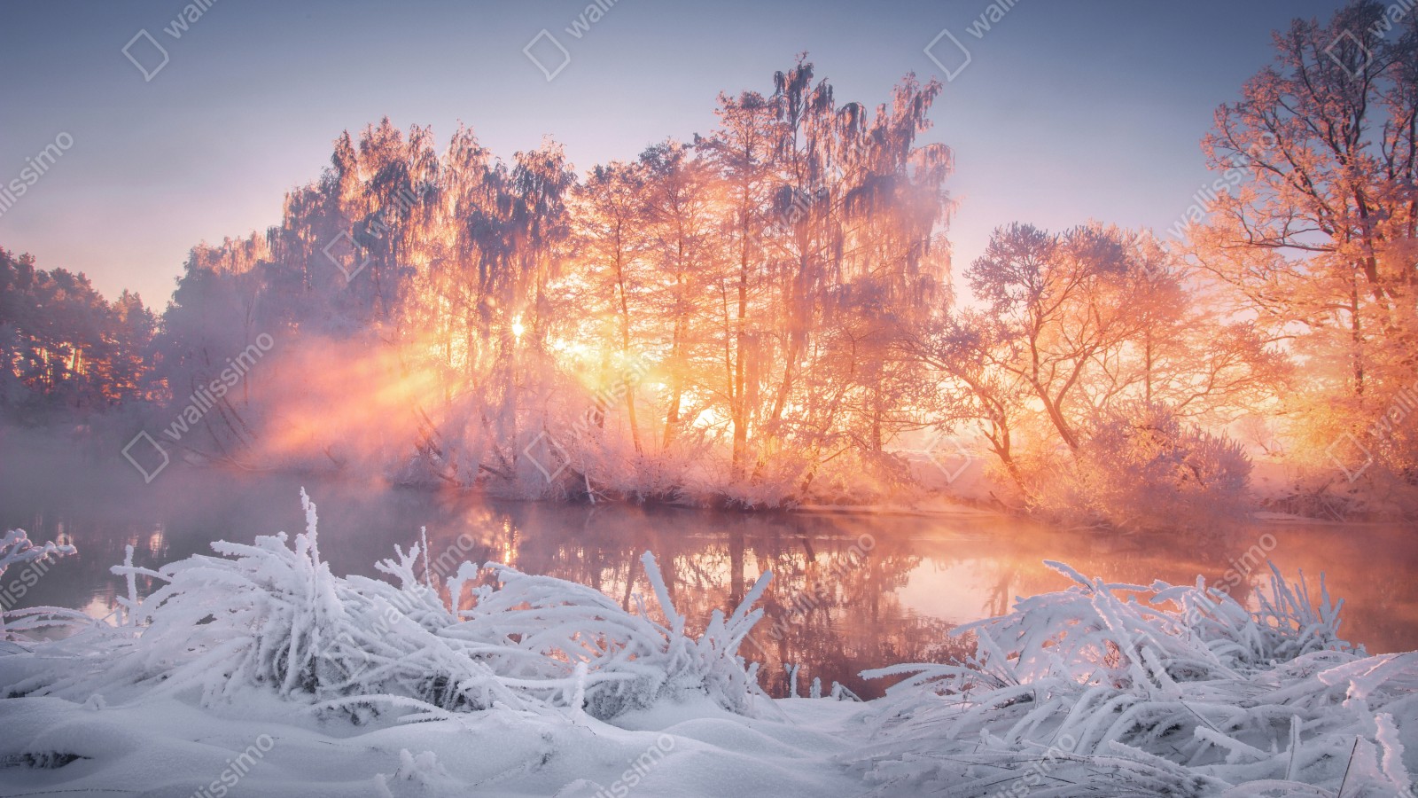 Naklejka repozycjonowalna Zimowy wschód słońca nad zamarzniętą rzeką