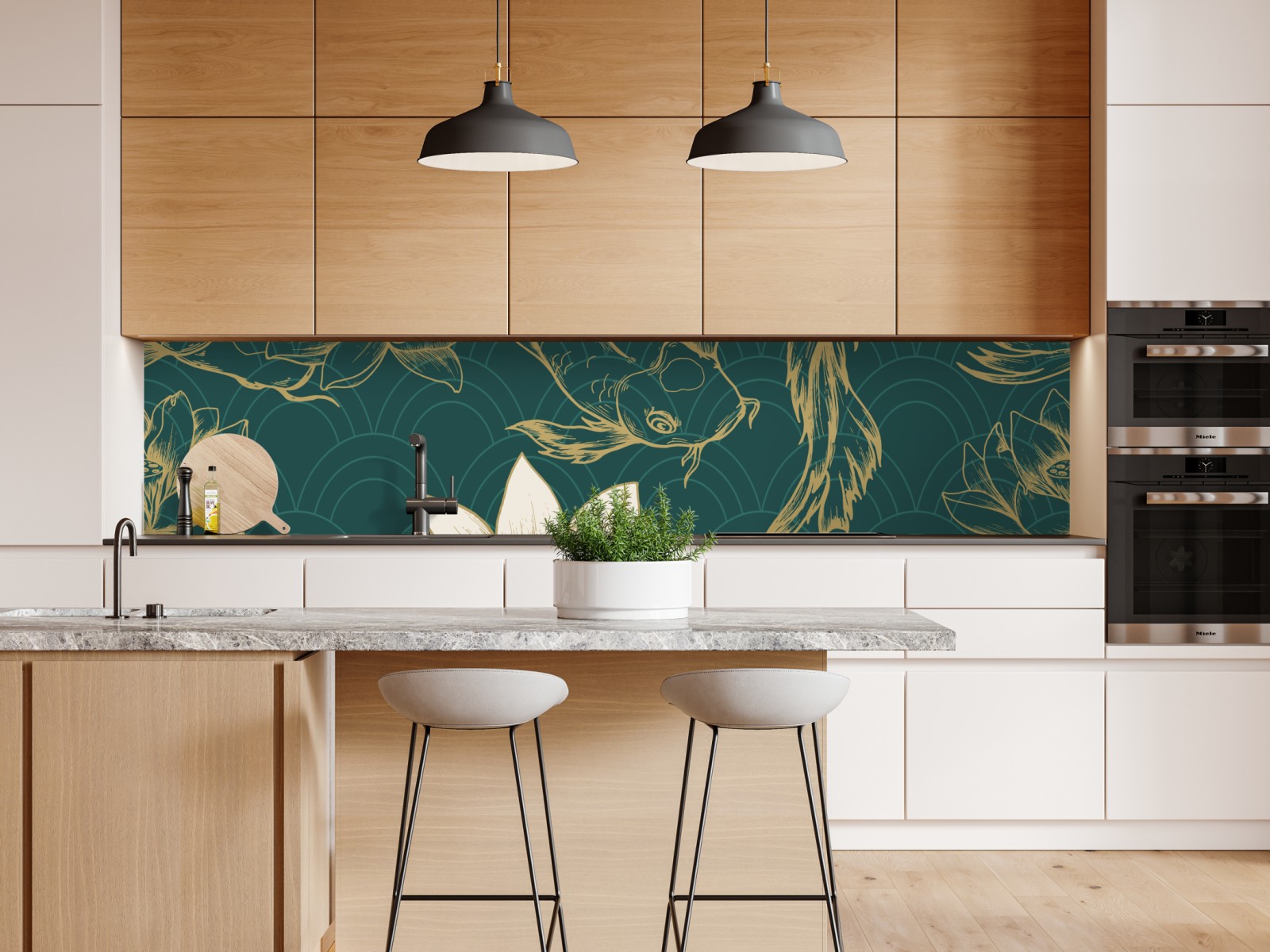 Naklejka repozycjonowalna Orientalny wzór koi i lotosów w turkusie i złocie