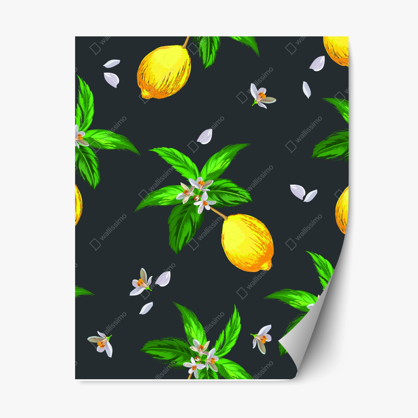 - botaniczny, kwiatowy, letni, białe kwiaty, zielone liście, dekoracja kuchni, cytryna, cytrus, powtarzalny wzór, cytrynowy wzór