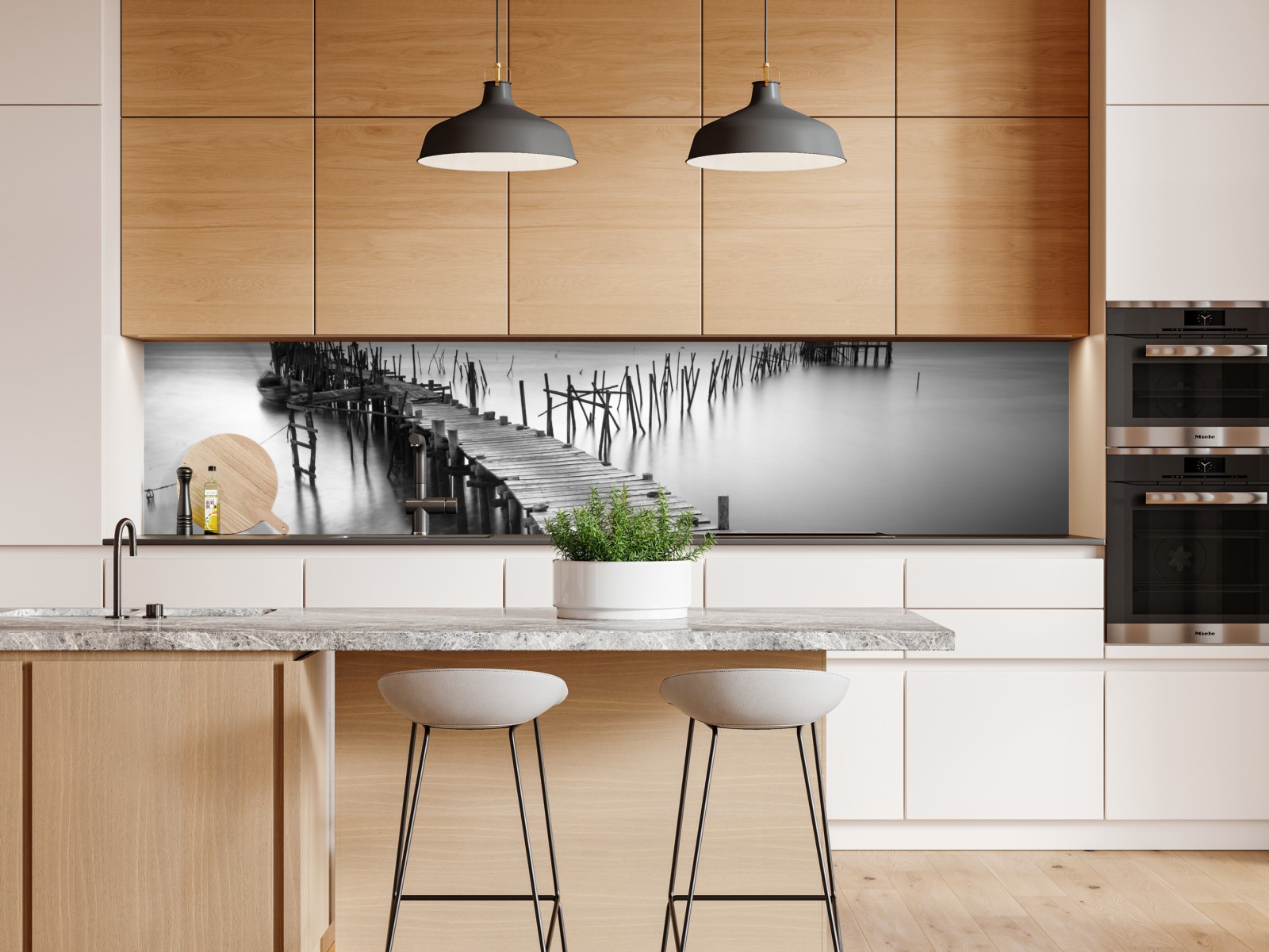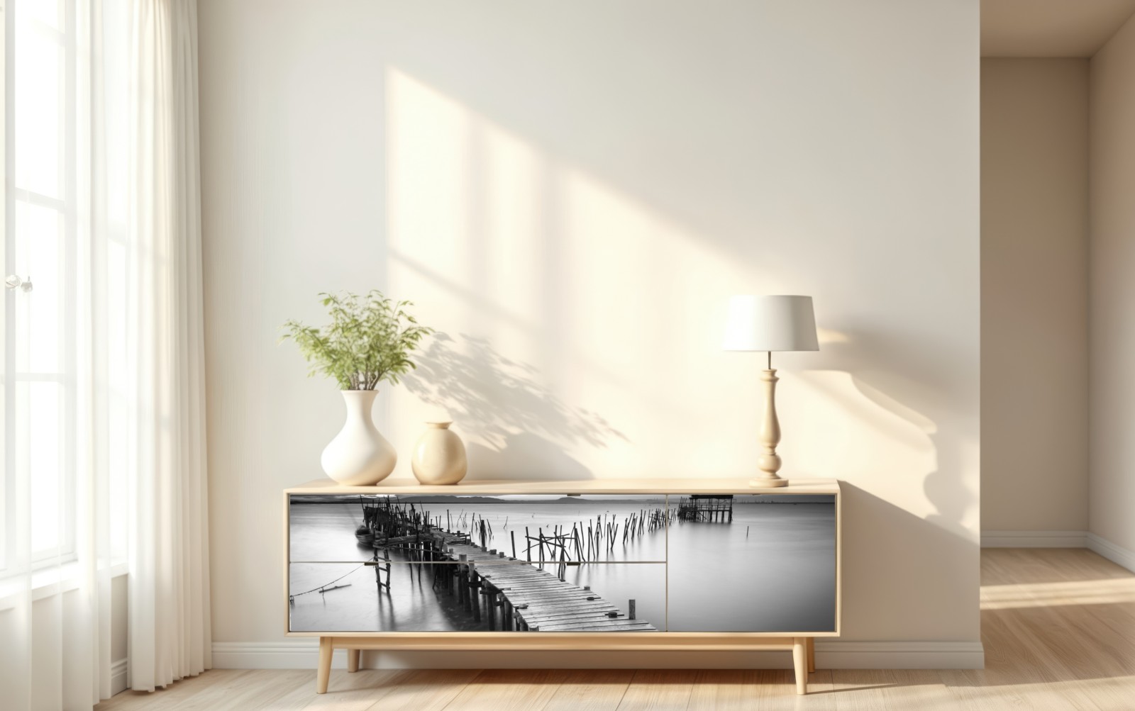 Minimalistyczna monochromatyczna scena z drewnianym pomostem nad spokojną wodą, która wnosi elegancki i wyciszony akcent do wnętrza.