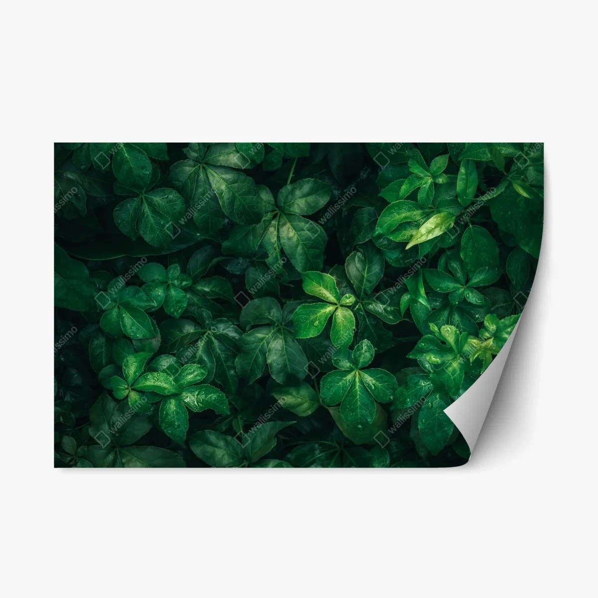 - botaniczny, natura, zielone liście, tropikalne liście, zbliżenie, bujna roślinność, struktura liścia, krople deszczu, nastrojowy, plakat ścienny