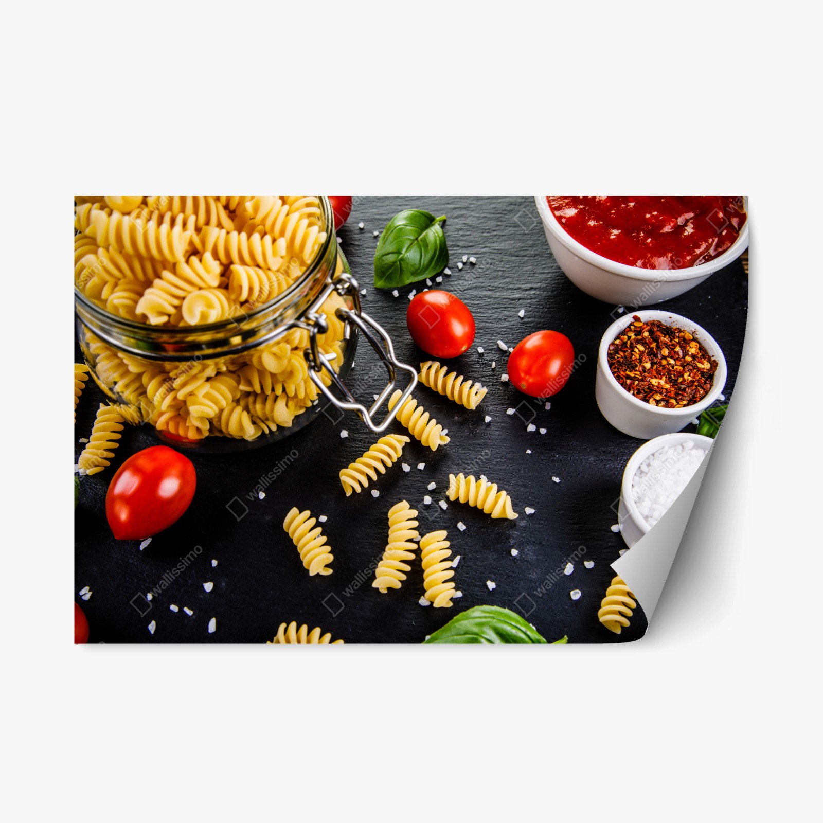 Naklejka repozycjonowalna Składniki do makaronu widok z góry z pomidorami i bazylią