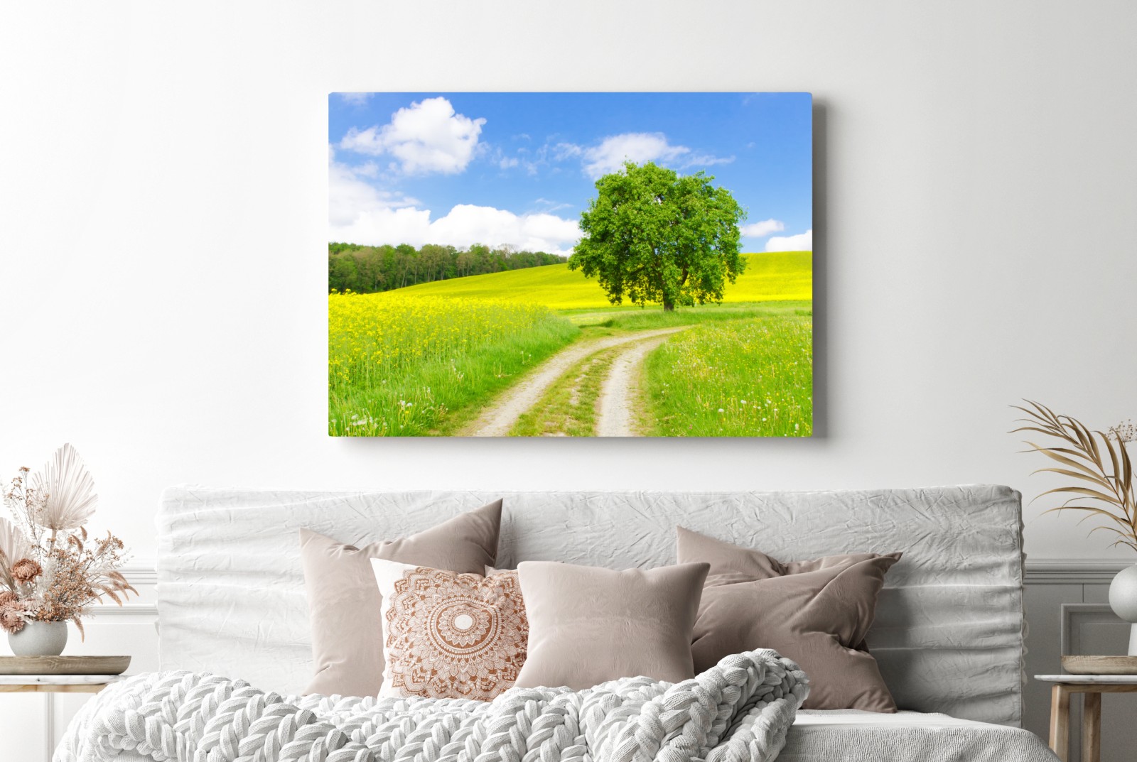 Obraz na płótnie Słoneczna wiejska ścieżka z samotnym drzewem