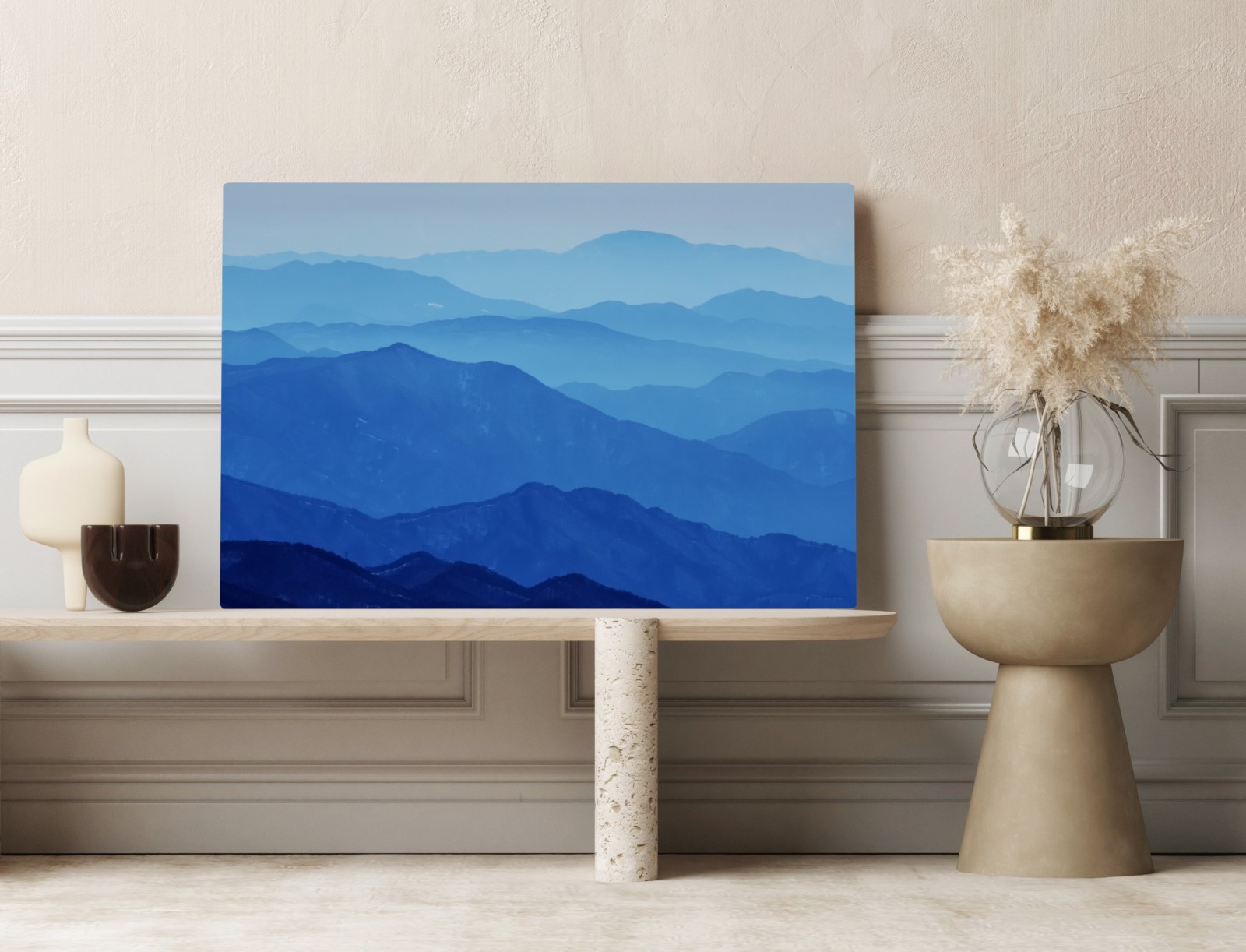 Wprowadź spokój do wnętrza dzięki tej mglistej niebieskiej panoramie gór z warstwowymi szczytami i delikatną atmosferą.WięcejMniej