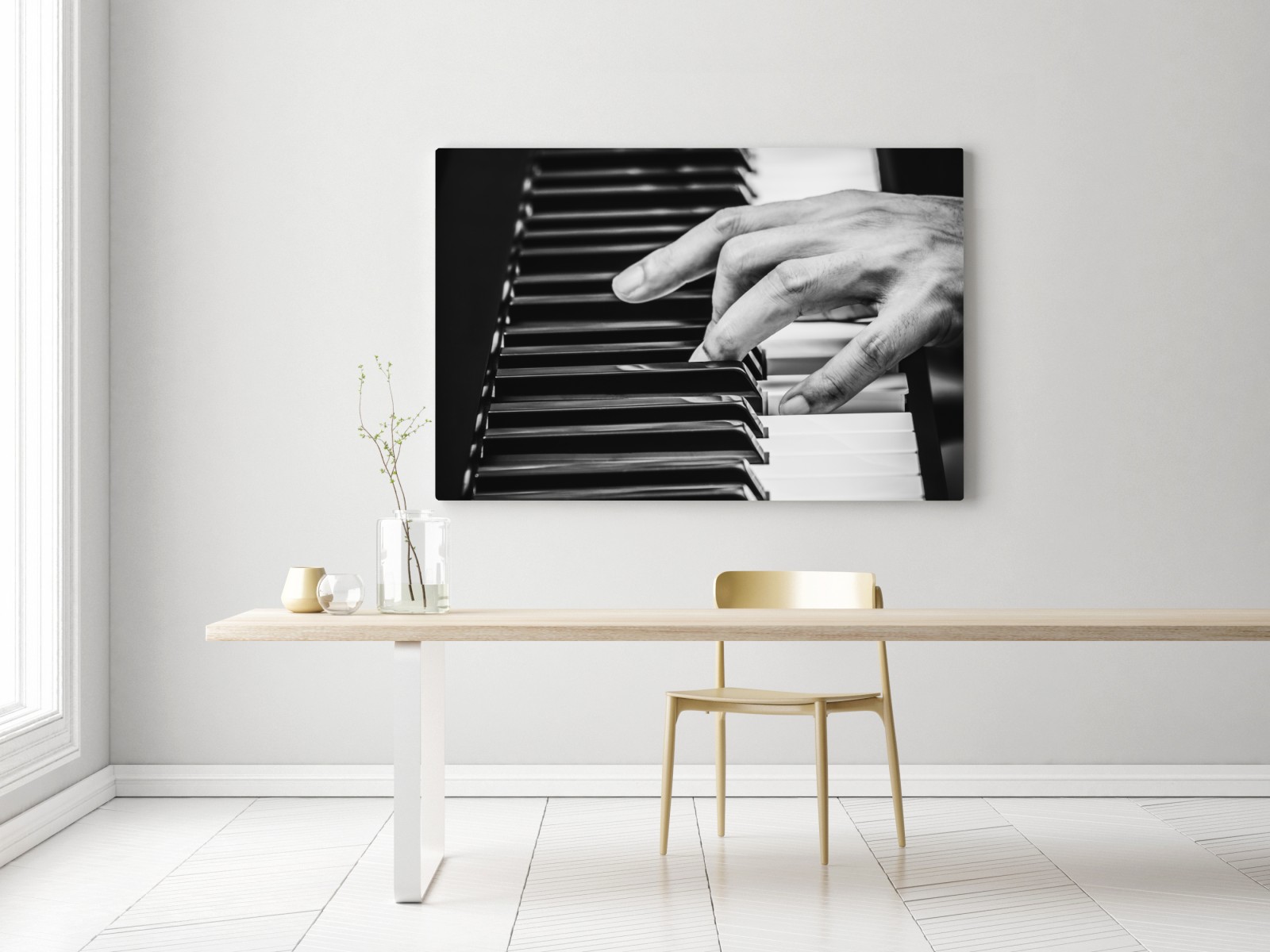Poczuj emocje muzyki dzięki efektownemu czarno-białemu zdjęciu dłoni przy klawiaturze fortepianu.WięcejMniej