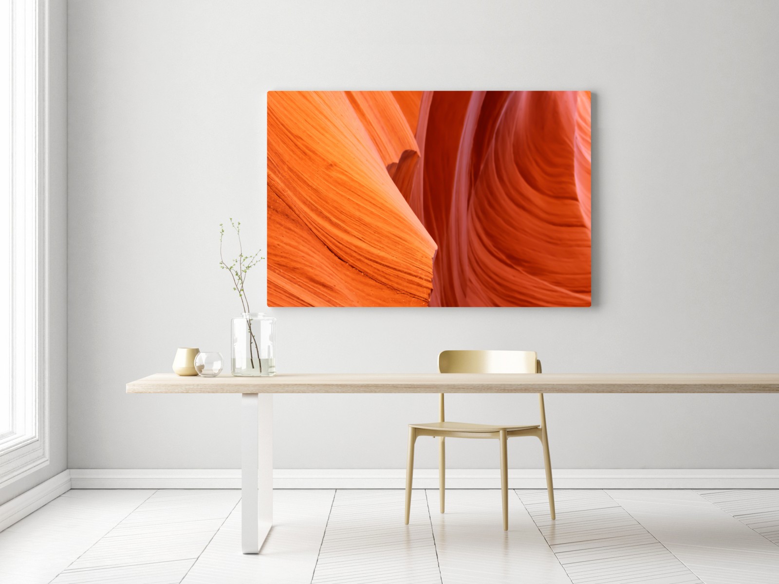 Odkryj ciepłe, płynne linie wyrzeźbionego piaskowca w tej efektownej abstrakcyjnej fotografii krajobrazu, idealnej do dodania naturalnej tekstury i ciepłych tonów do wnętrza.WięcejMniej