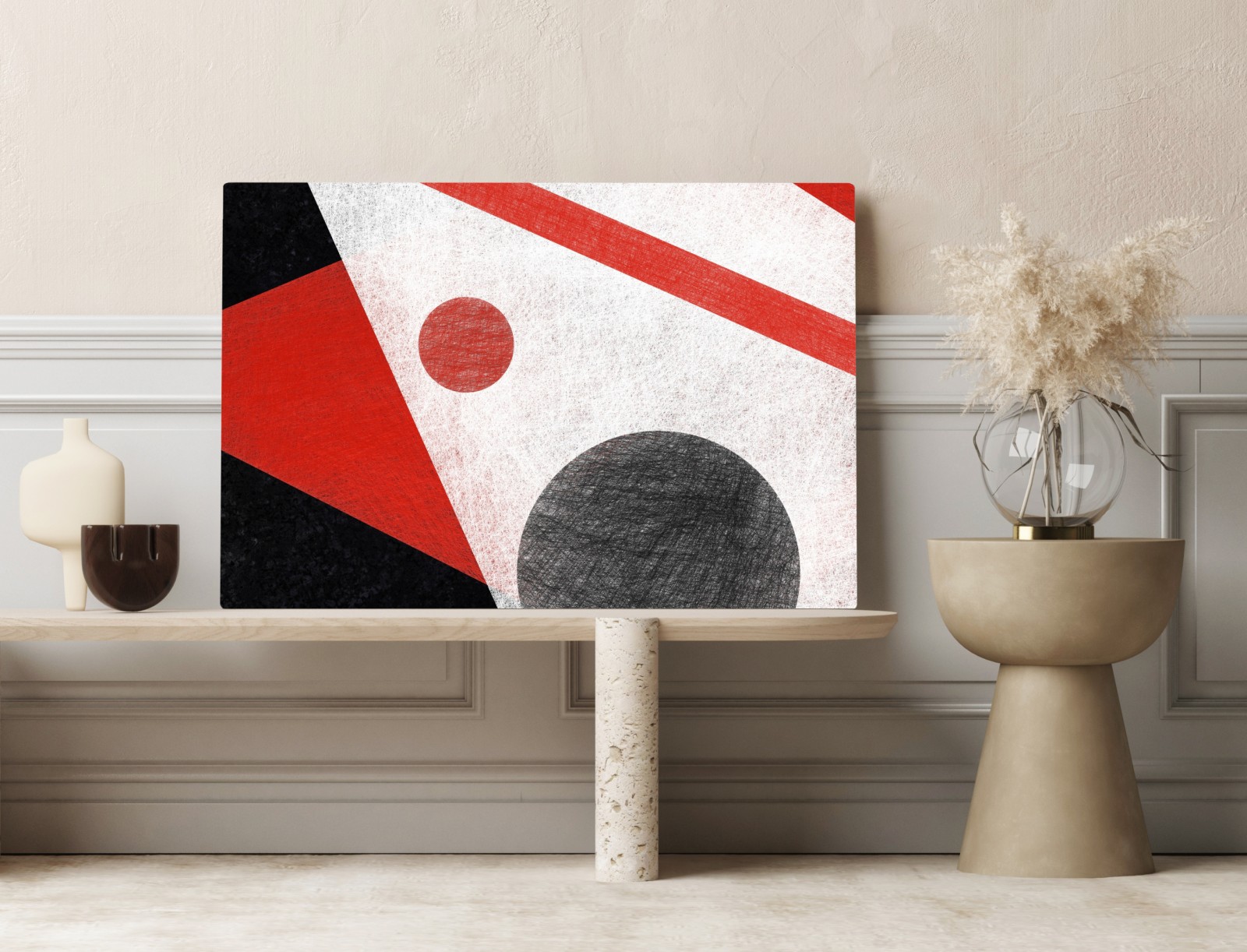 Ożyw swoją przestrzeń odważną geometryczną kompozycją w intensywnej czerwieni, czerni i bieli, idealną do nowoczesnych wnętrz.WięcejMniej