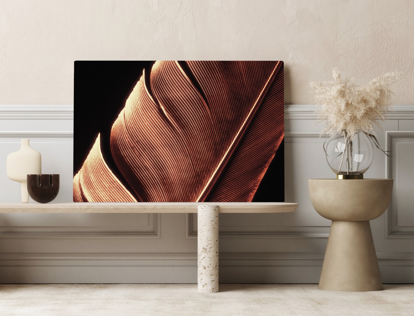 Wprowadź naturalną elegancję do wnętrza dzięki zbliżeniu pióra w ciepłych, złotych tonach i delikatnej fakturze.WięcejMniej