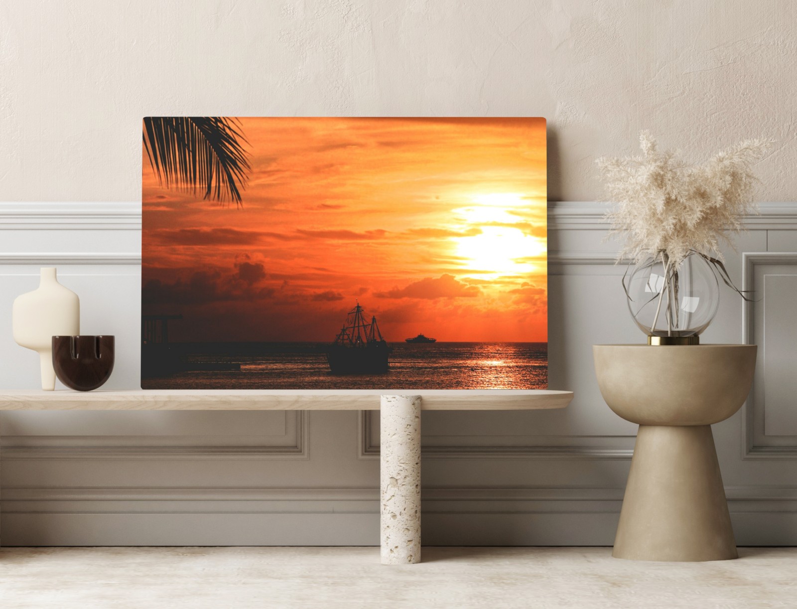 Wprowadź do wnętrza spokojną atmosferę tropikalnego zachodu słońca dzięki temu ciepłemu pejzażowi plażowemu, który przywołuje relaks i chęć podróży.WięcejMniej