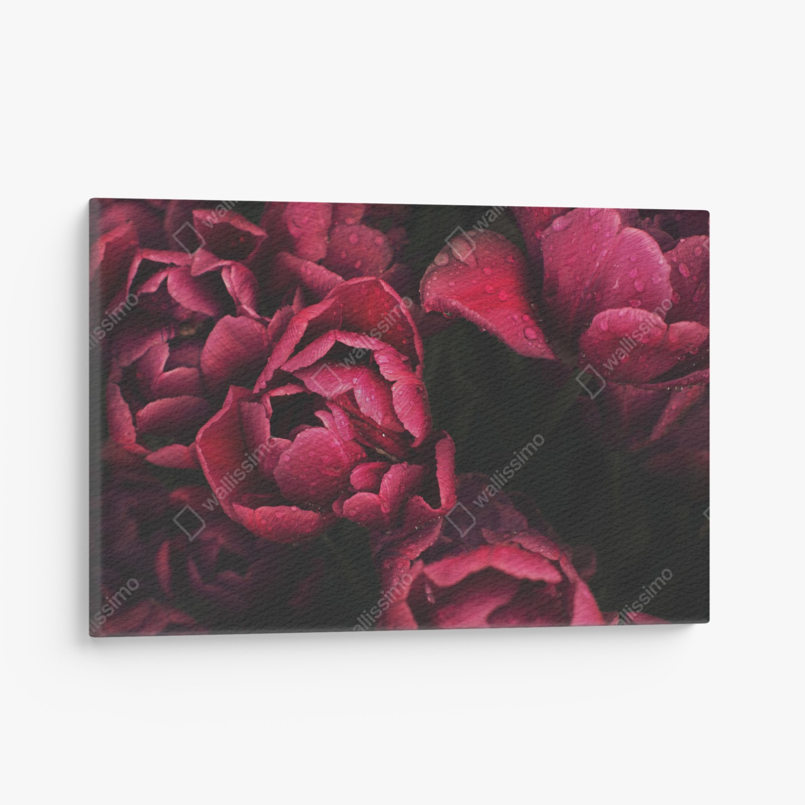 Obraz na płótnie Głębokie bordowe kwiaty z kroplami wody