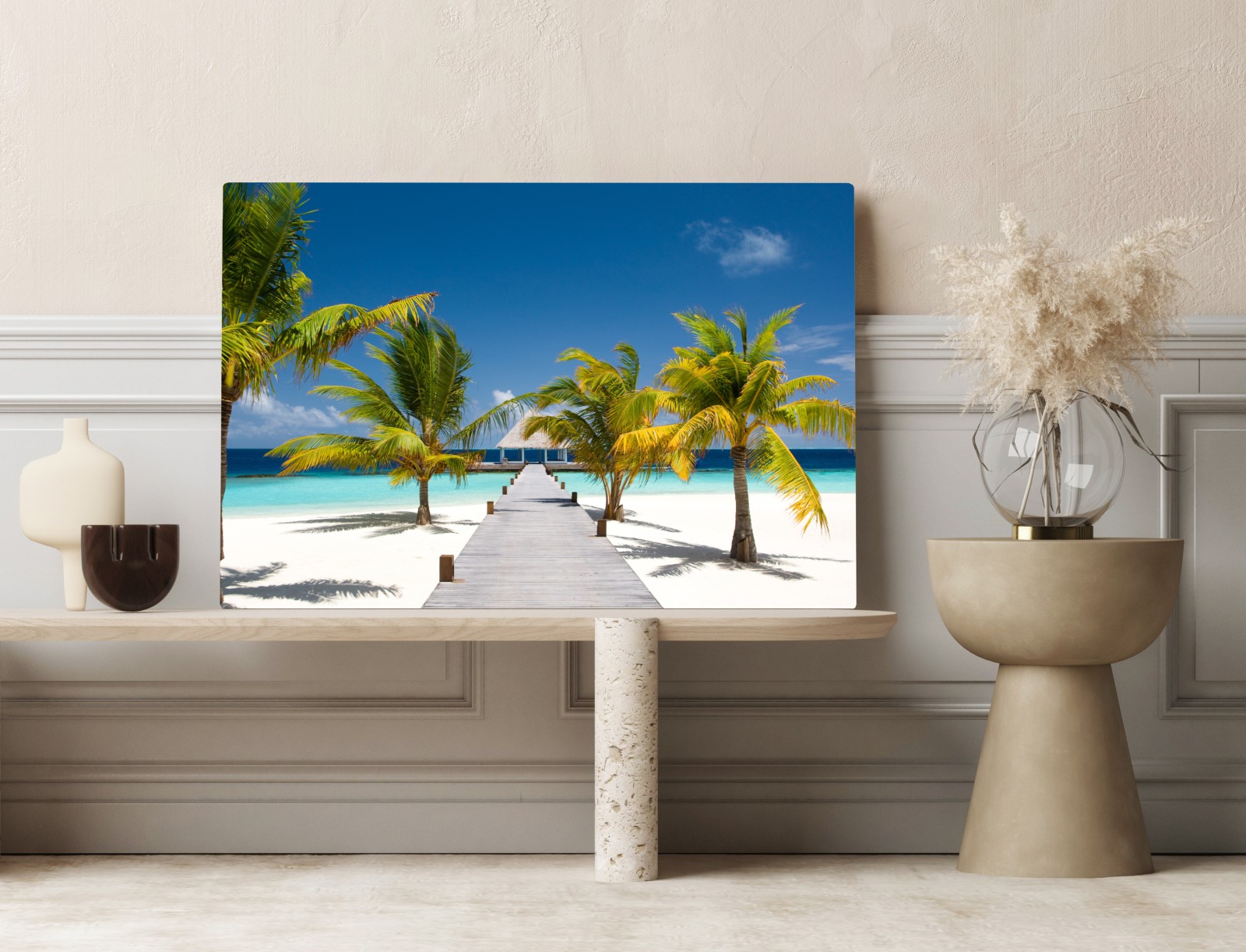 Wprowadź do wnętrza tropikalny spokój dzięki energetycznemu obrazowi plaży z palmami, drewnianym pomostem i turkusową wodą.WięcejMniej