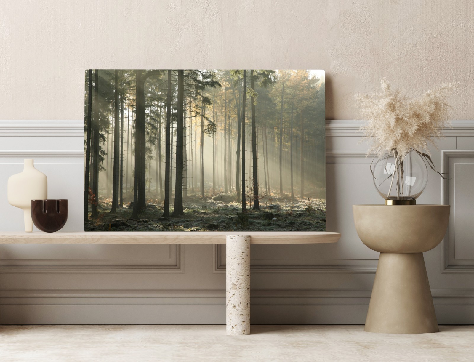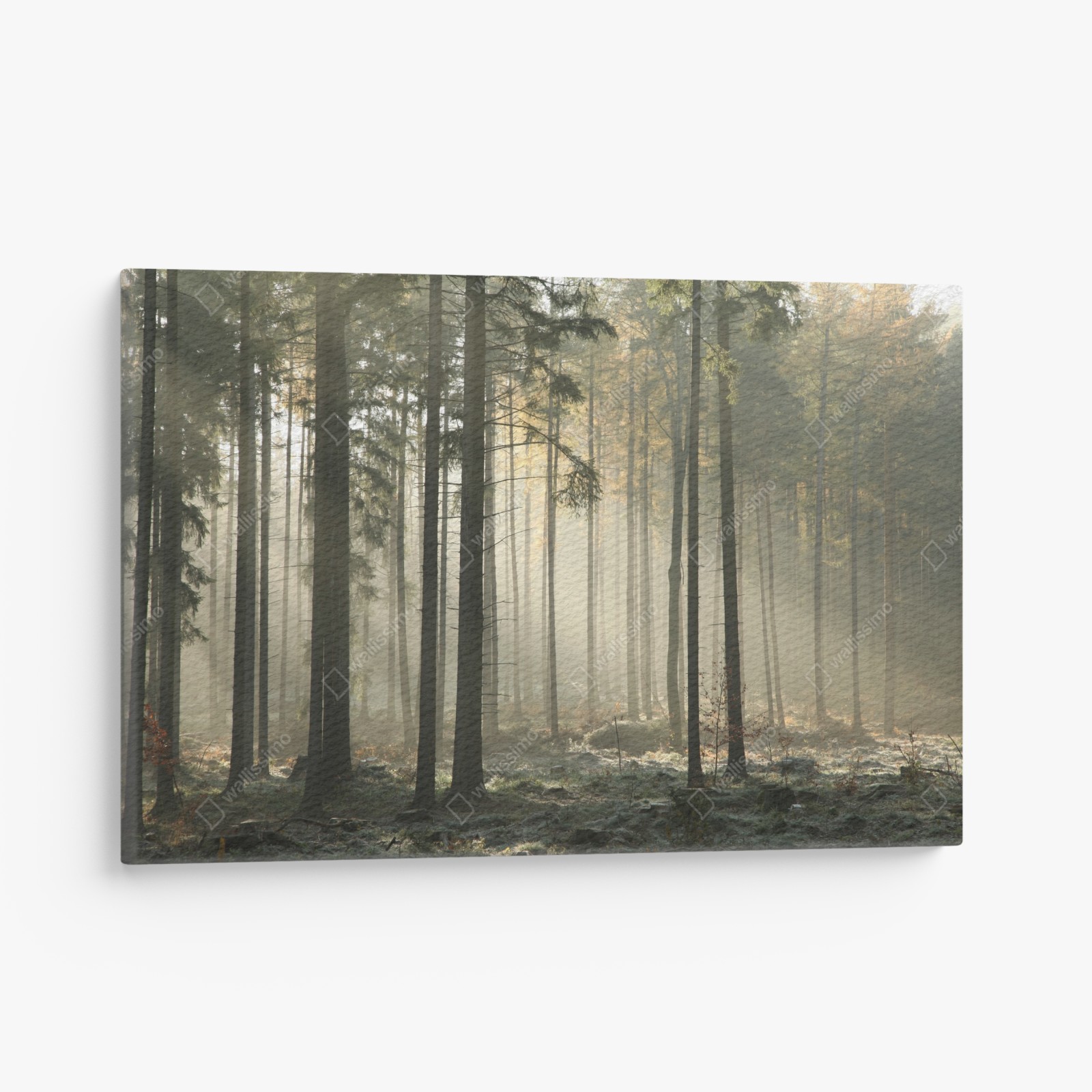 Obraz na płótnie Mglisty poranek w lesie z promieniami słońca