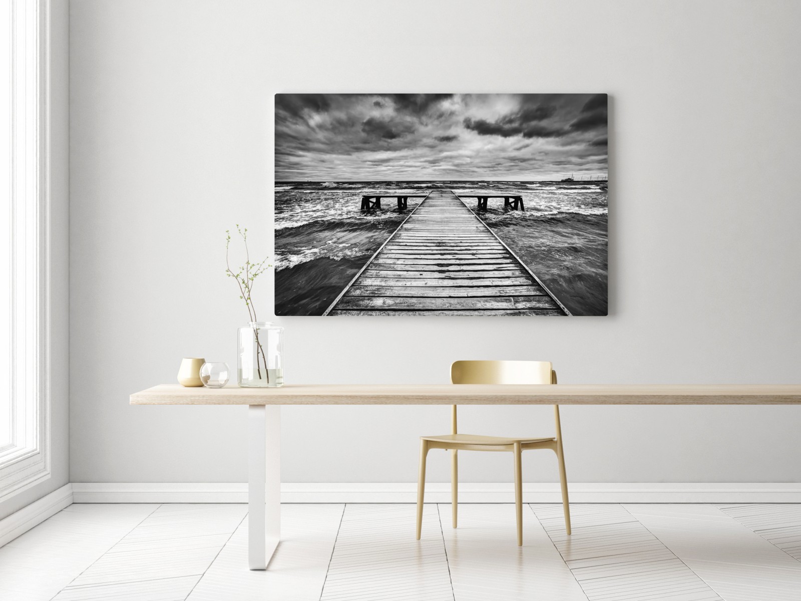 Obraz na płótnie Dramatyczne czarno-białe molo prowadzące w burzliwe morze