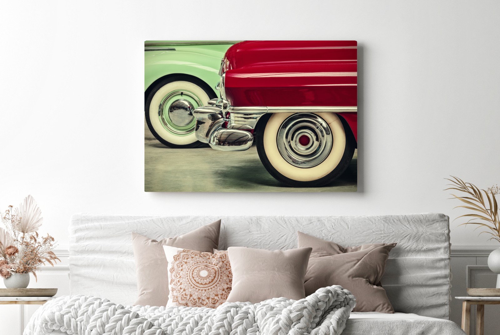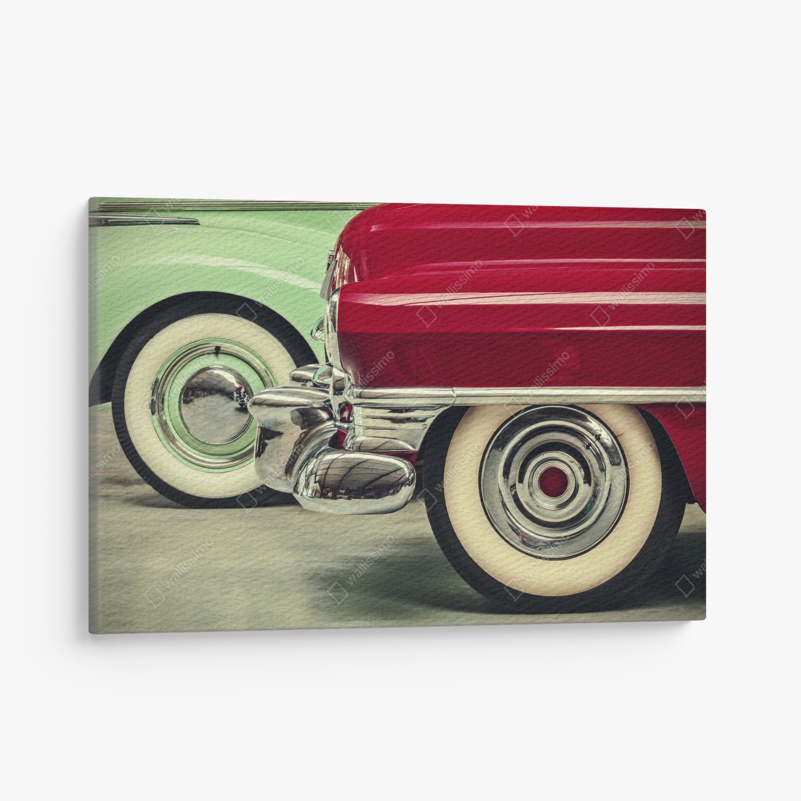 Obraz na płótnie Zbliżenie klasycznych samochodów w czerwieni i mięcie