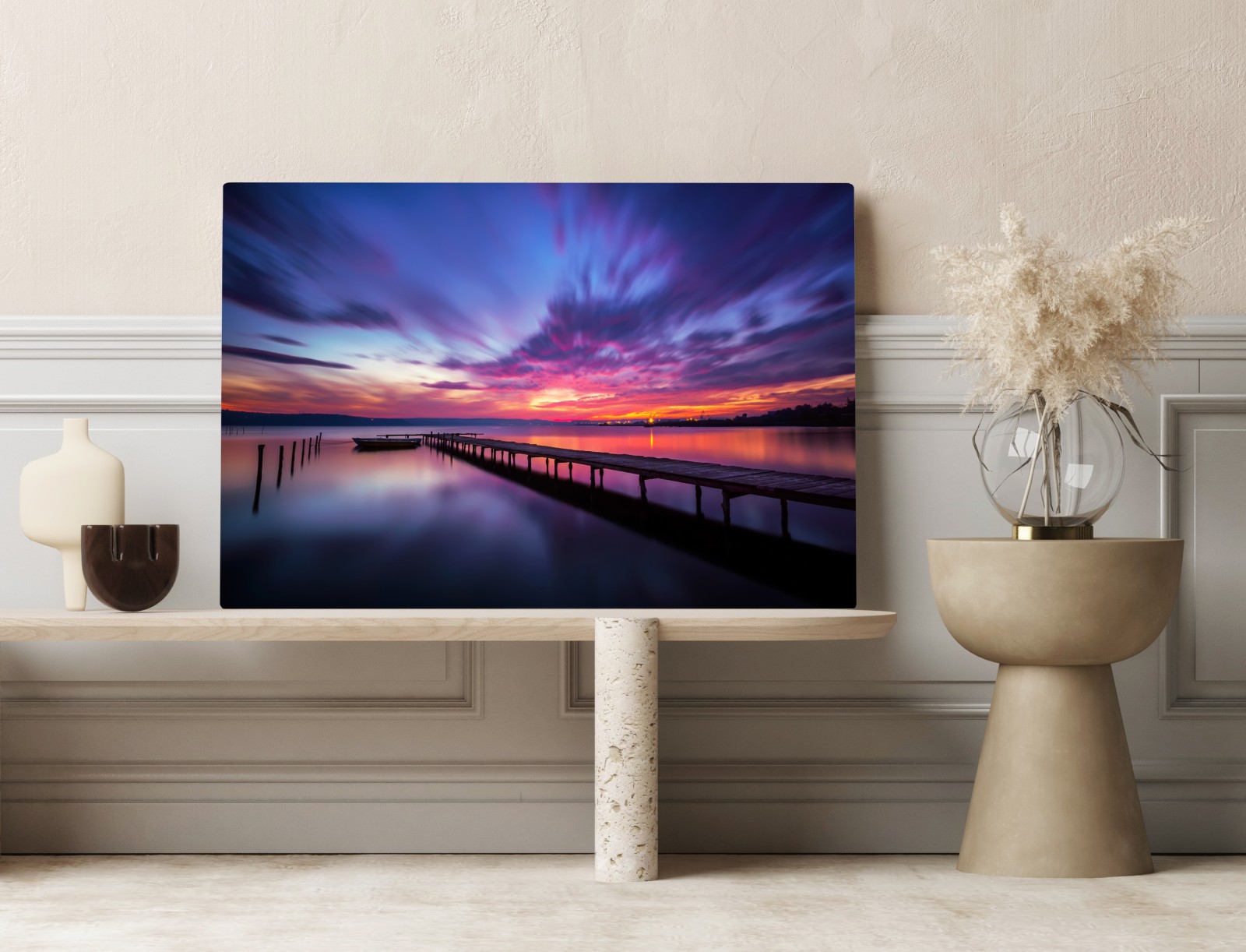 Dodaj spokój i kolor do wnętrza dzięki temu żywemu zachodowi słońca nad jeziorem z drewnianym pomostem i refleksami.WięcejMniej