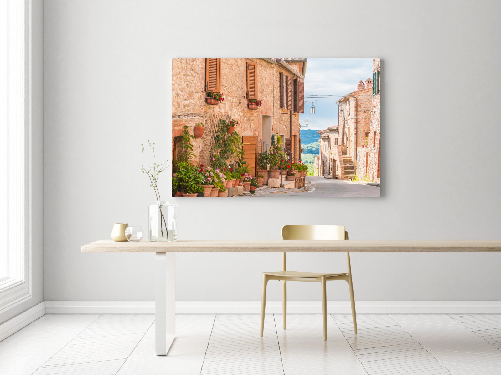 Obraz na płótnie Średniowieczna ulica w Toskanii z doniczkami z kwiatami