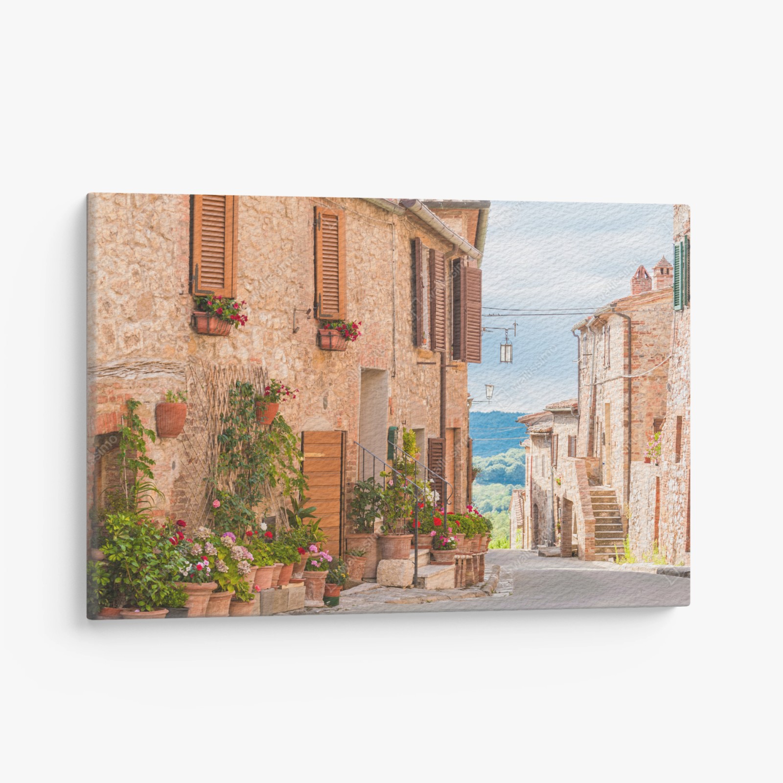 Obraz na płótnie Średniowieczna ulica w Toskanii z doniczkami z kwiatami