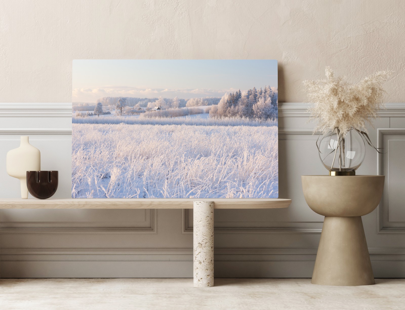 Odkryj spokojną urodę łąki pokrytej szronem skąpanej w delikatnym porannym świetle, idealną do ozdobienia wnętrza zimowym klimatem.WięcejMniej