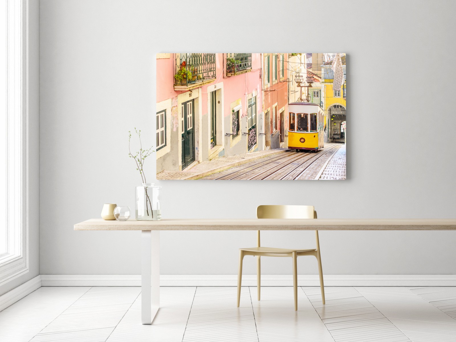 Obraz na płótnie Słoneczny tramwaj na pastelowej ulicy w Lizbonie
