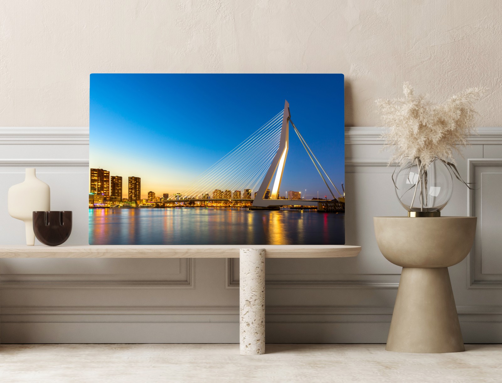 Poczuj nowoczesną elegancję panoramy Rotterdamu dzięki żywemu widokowi Mostu Erazma odbijającemu się w rzece.WięcejMniej