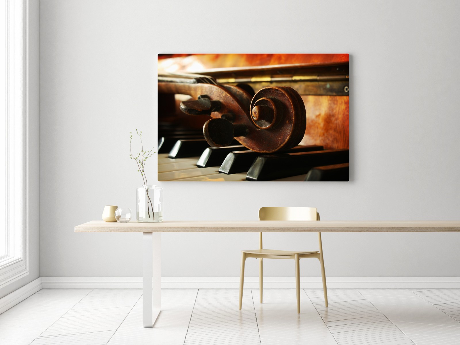 Obraz na płótnie Zabytkowa główka skrzypiec na klawiszach fortepianu