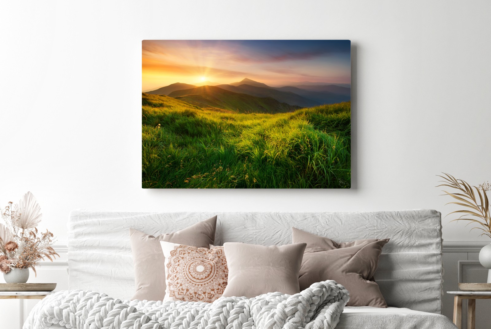 Obraz na płótnie Wschód słońca nad zieloną doliną górską
