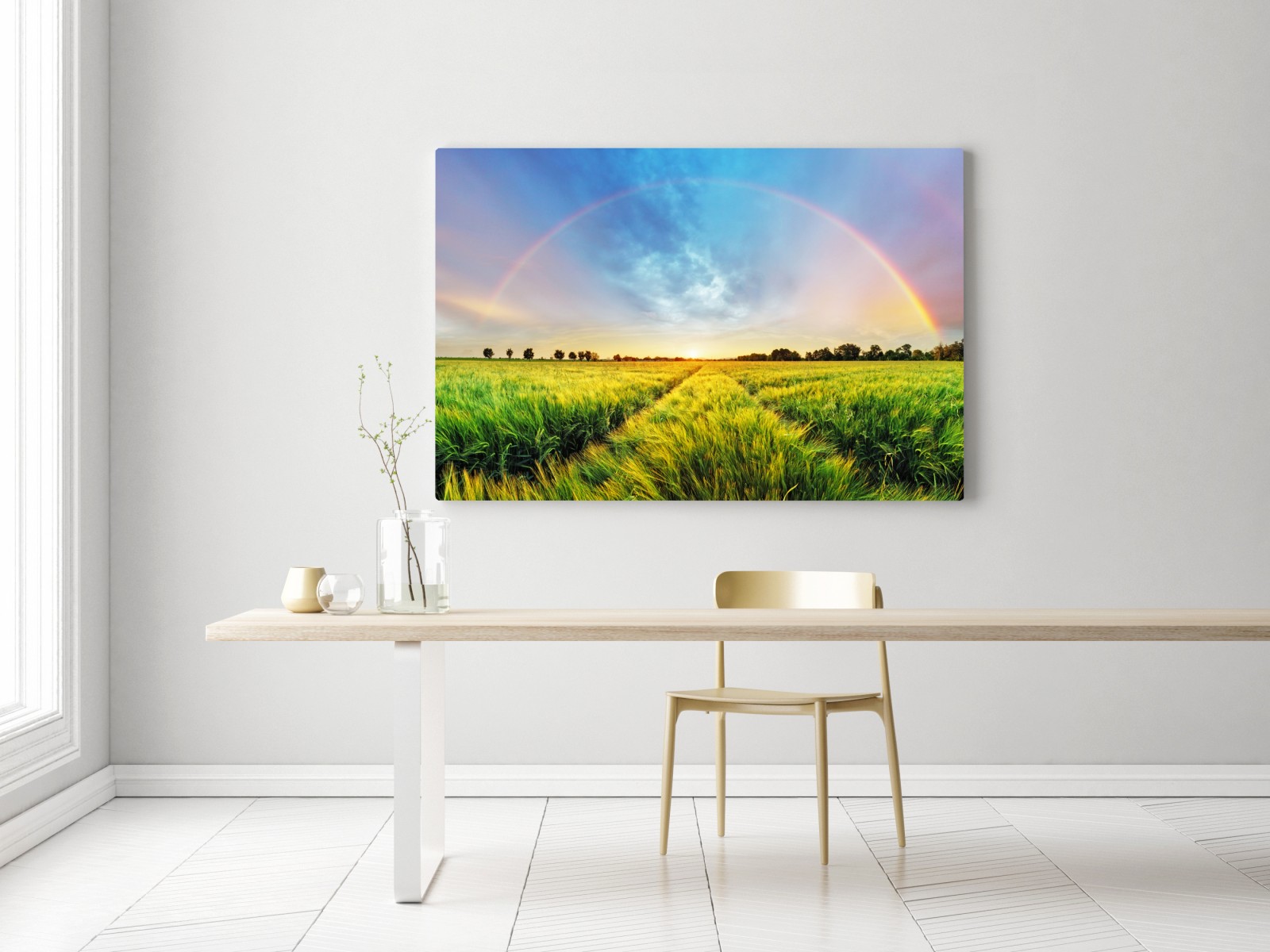 Obraz na płótnie Tęcza nad złotym polem pszenicy o zachodzie słońca