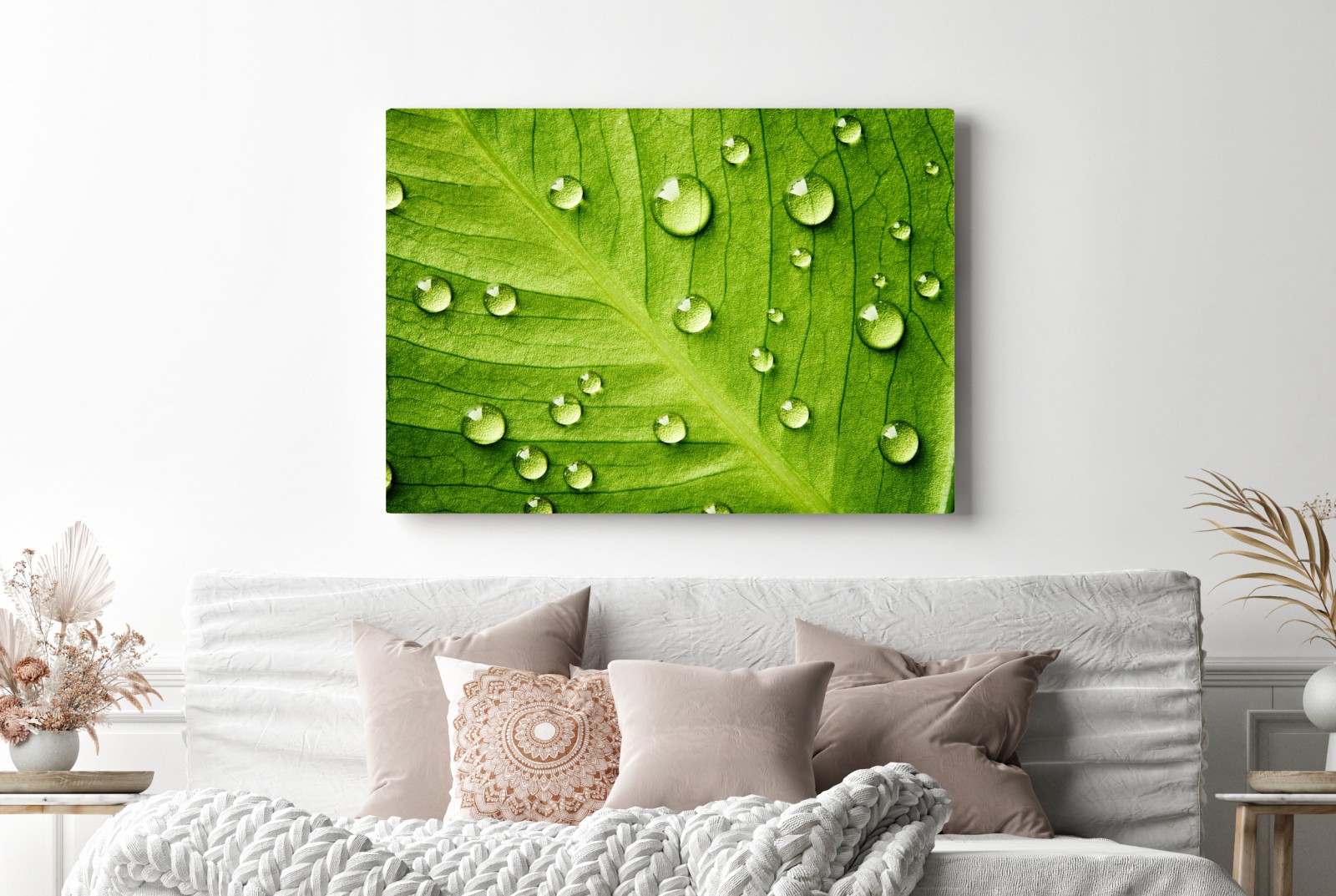 Obraz na płótnie Świeży zielony liść z kroplami wody
