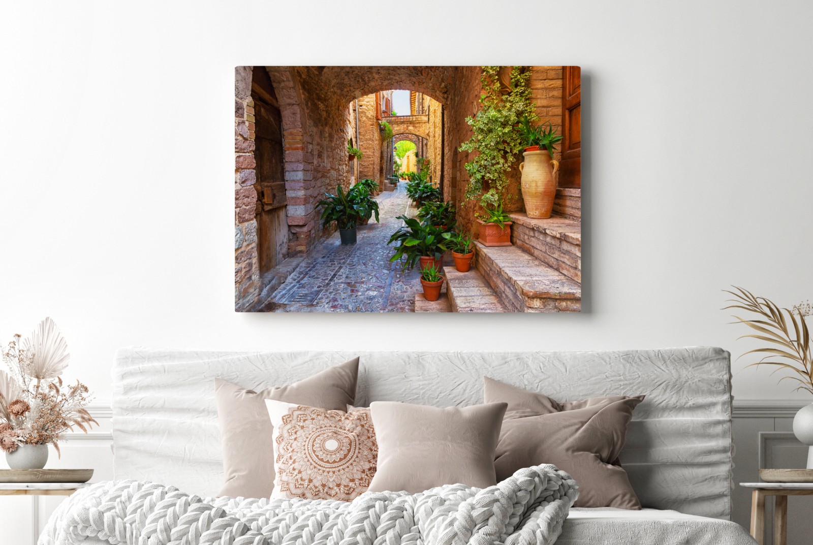Obraz na płótnie Słoneczna uliczka z doniczkami w Spello