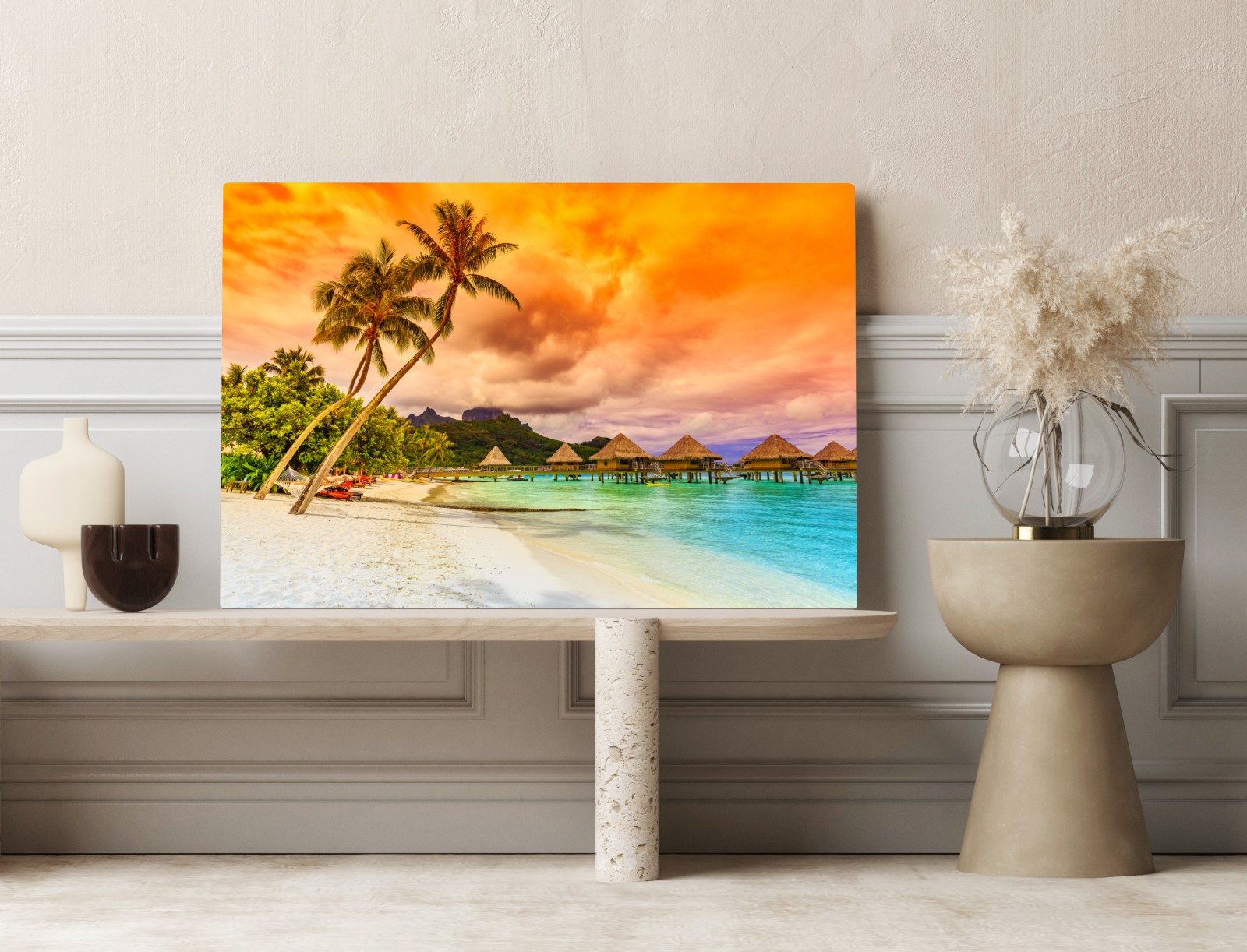 Wprowadź ciepły blask tropikalnego zachodu słońca do swojego wnętrza, prezentując palmy i bungalowy na wodzie.WięcejMniej