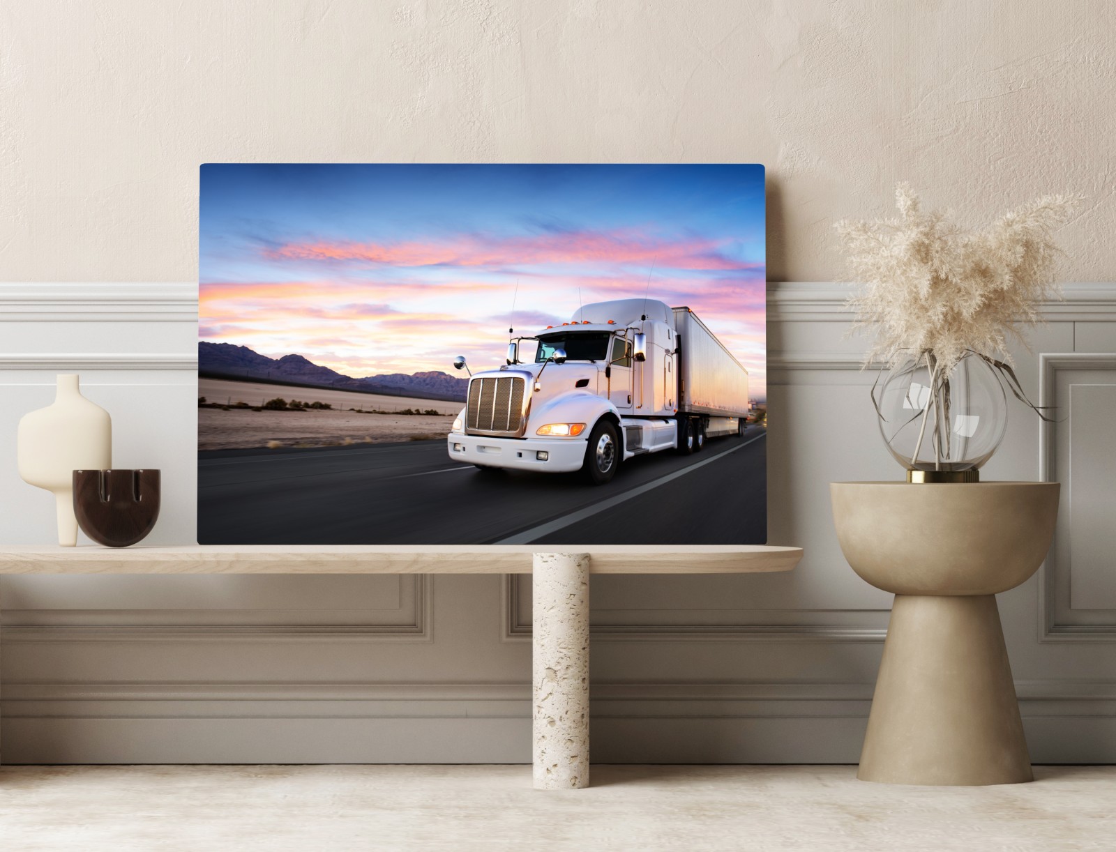 Obraz na płótnie Ciężarówka w ruchu o zachodzie słońca