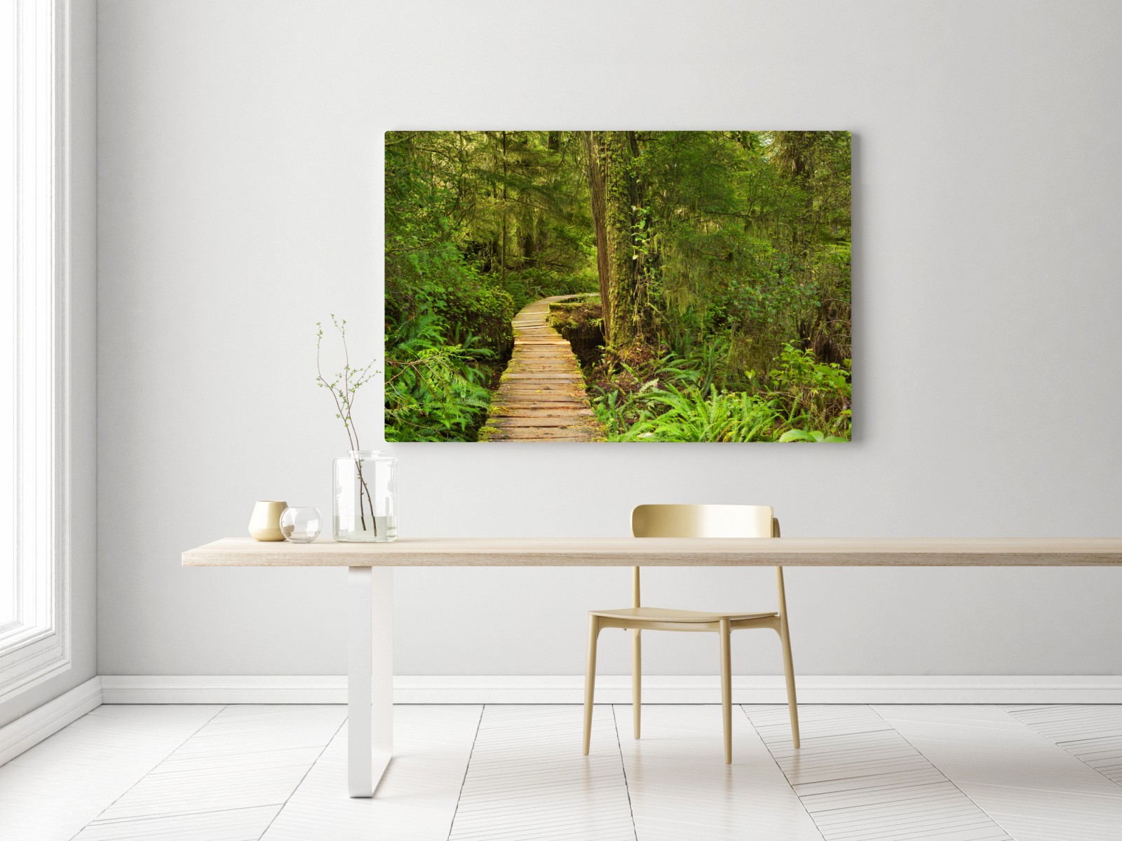 Wprowadź spokój bujnego lasu deszczowego Pacific Rim do swojego wnętrza dzięki tej fotografii krętego pomostu, która zachęca do relaksu i odkrywania.WięcejMniej