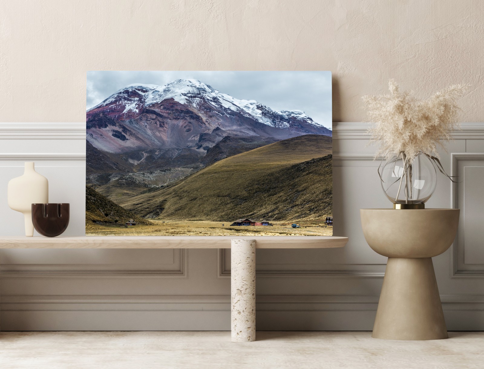 Przenieś spokój górskiej scenerii do wnętrza dzięki temu zdjęciu ukazującemu zaśnieżony szczyt, łagodne wzgórza i odosobnioną chatę.WięcejMniej