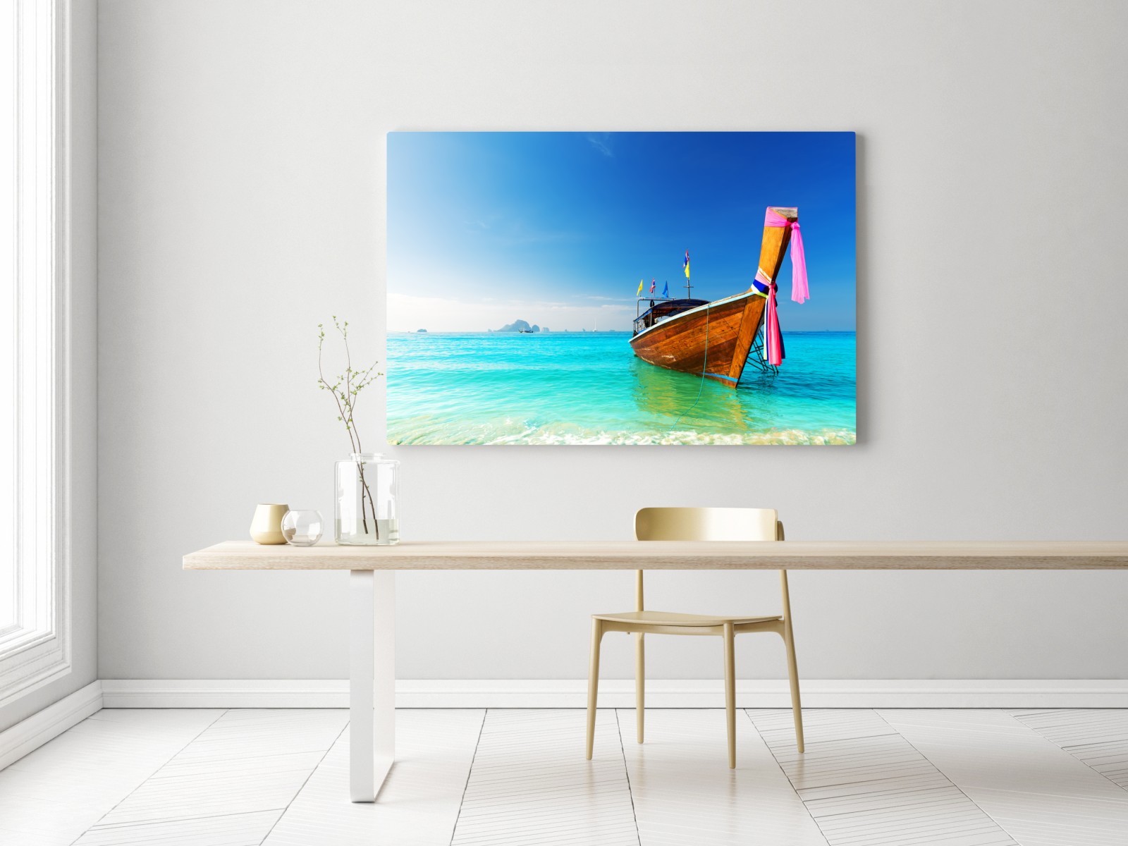 Obraz na płótnie Długa łódź na turkusowej plaży, Morze Andamańskie