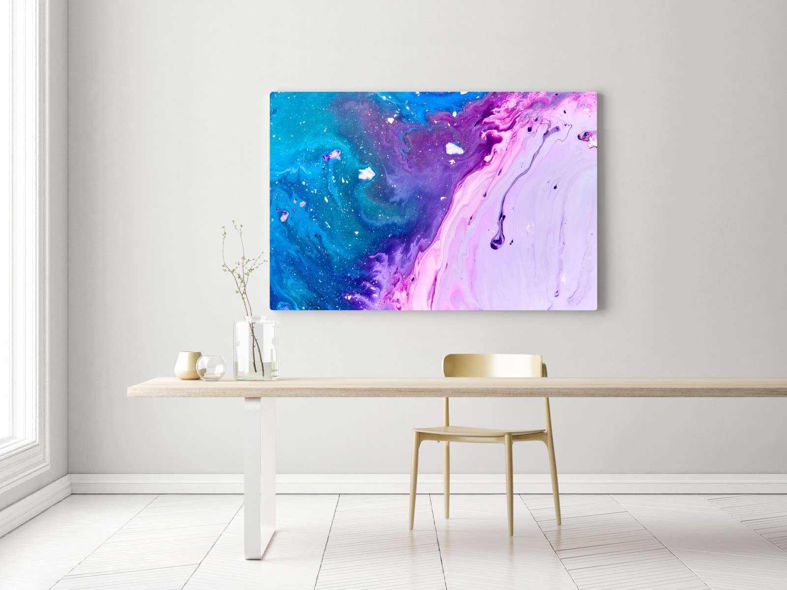Odśwież swoje wnętrze żywą niebiesko-fioletową abstrakcją akrylową, która wnosi nowoczesną energię i uspokajający przepływ.WięcejMniej