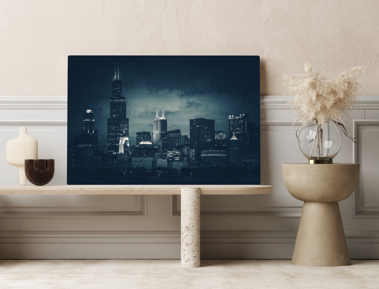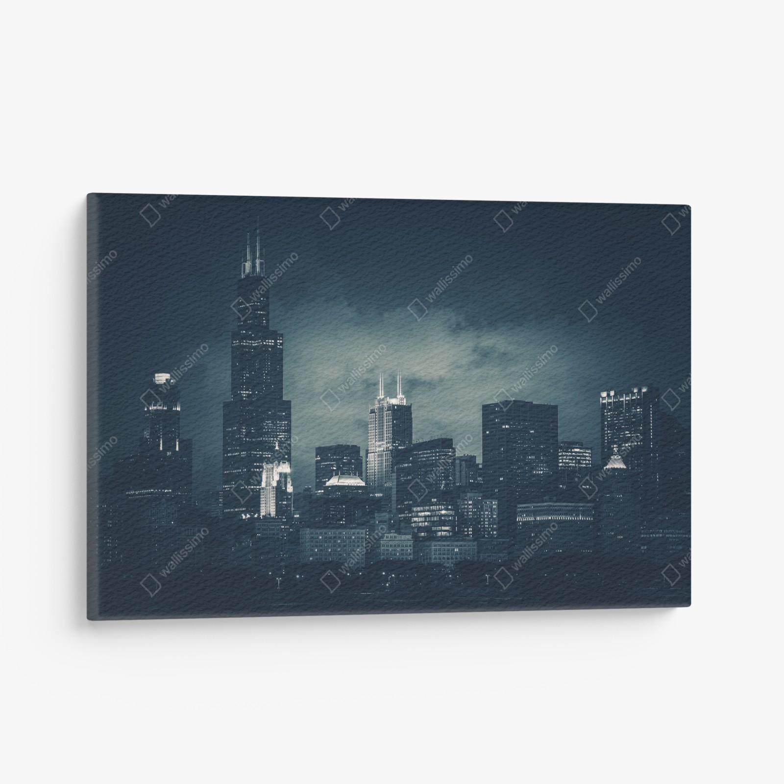 Dodaj do wnętrza nastrojową panoramę Chicago w głębokich niebieskich tonach, idealną do nowoczesnych i miejskich aranżacji.WięcejMniej