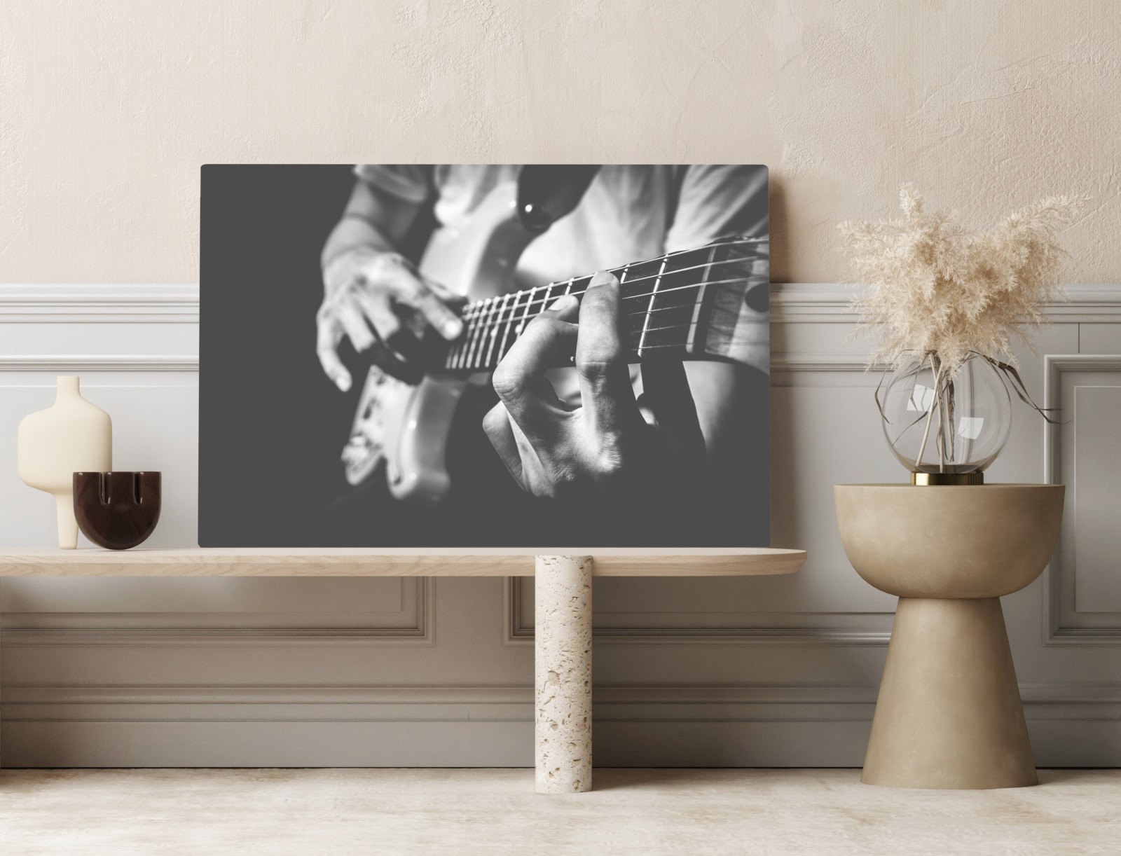 Poczuj pasję muzyki dzięki wyrazistemu monochromatycznemu zbliżeniu gitary, idealnemu dla miłośników muzyki i nowoczesnych wnętrz.WięcejMniej