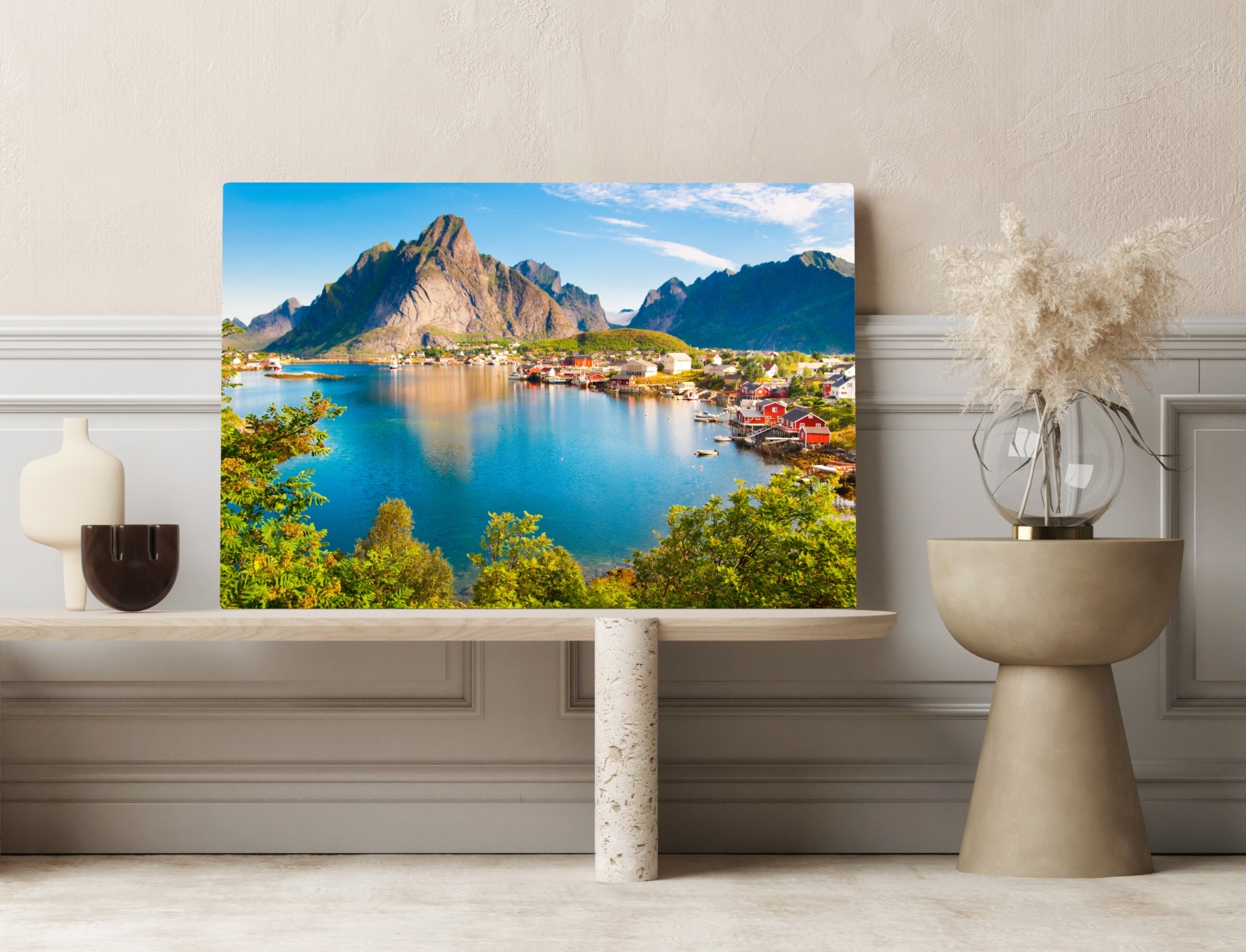Obraz na płótnie Malowniczy fiord z górską wioską i odbiciami