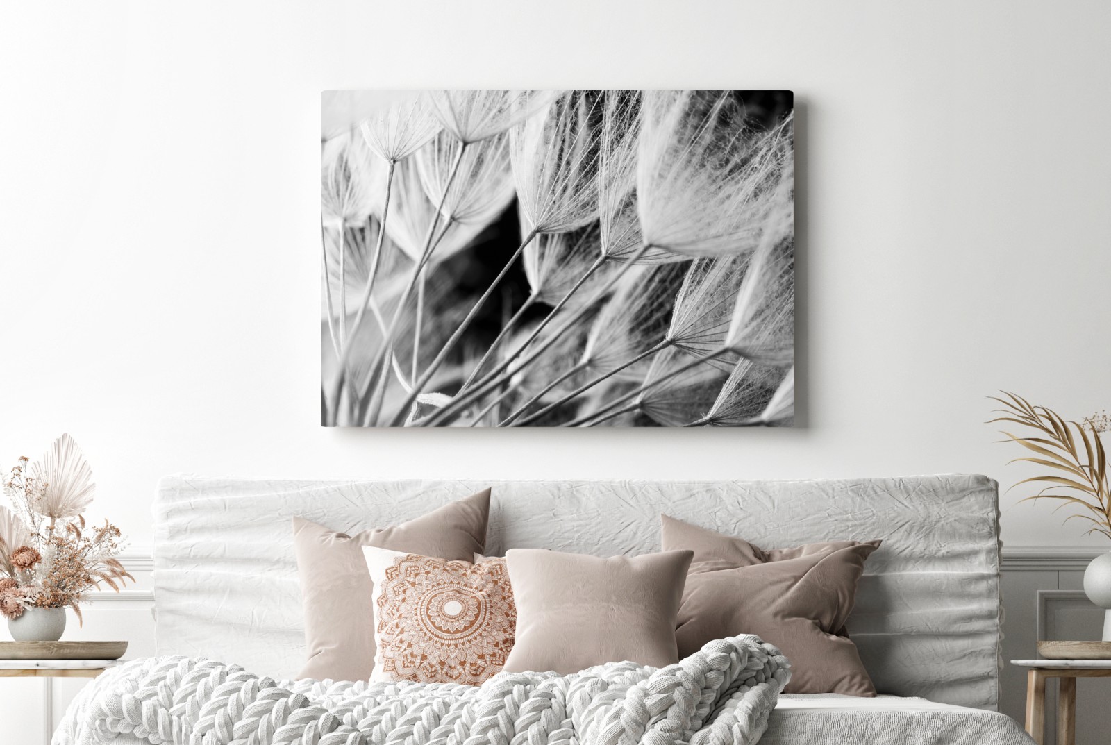Eleganckie czarno-białe zbliżenie nasion mniszka wnosi kojącą, minimalistyczną estetykę do wnętrza.WięcejMniej